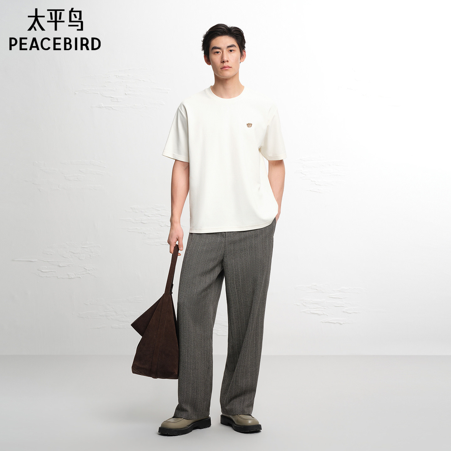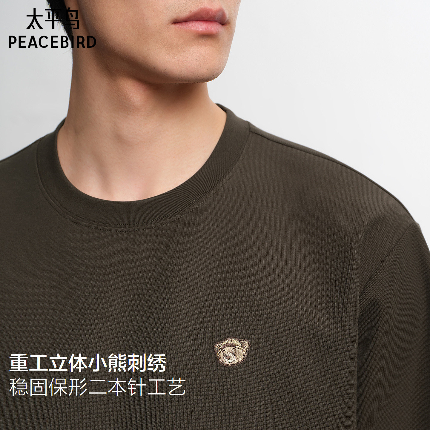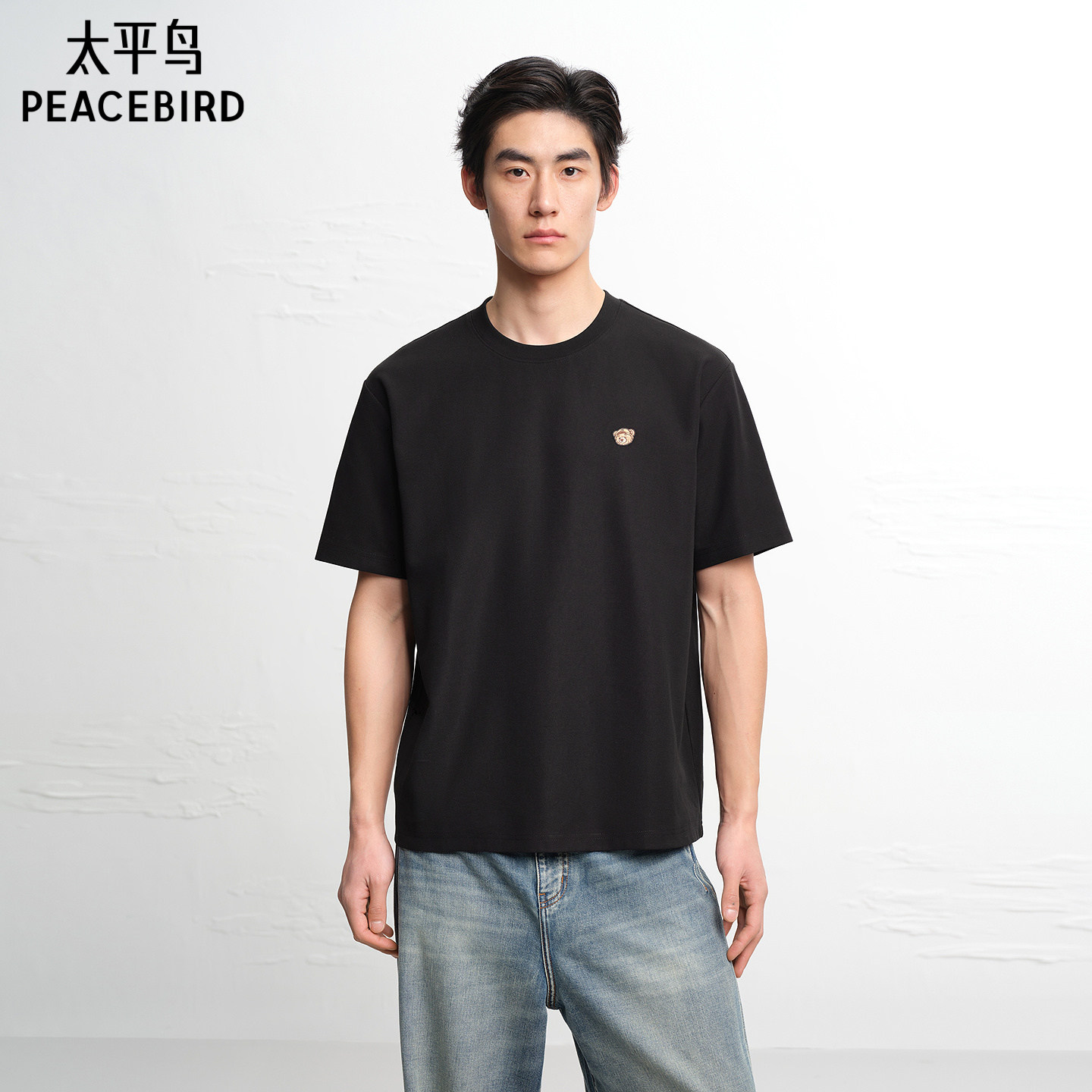 太平鸟男装小熊刺绣情侣体恤衫纯色时尚短袖T恤夏新款重磅半袖潮