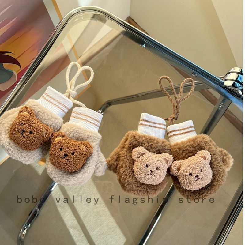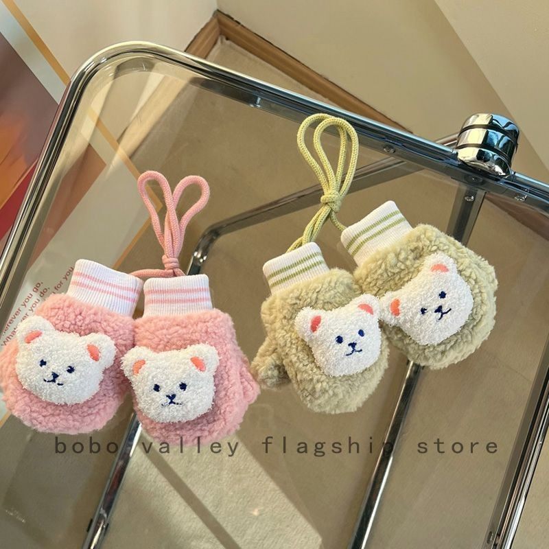 儿童手套秋冬季宝宝小熊男童加绒保暖女童挂脖连指手包套可爱