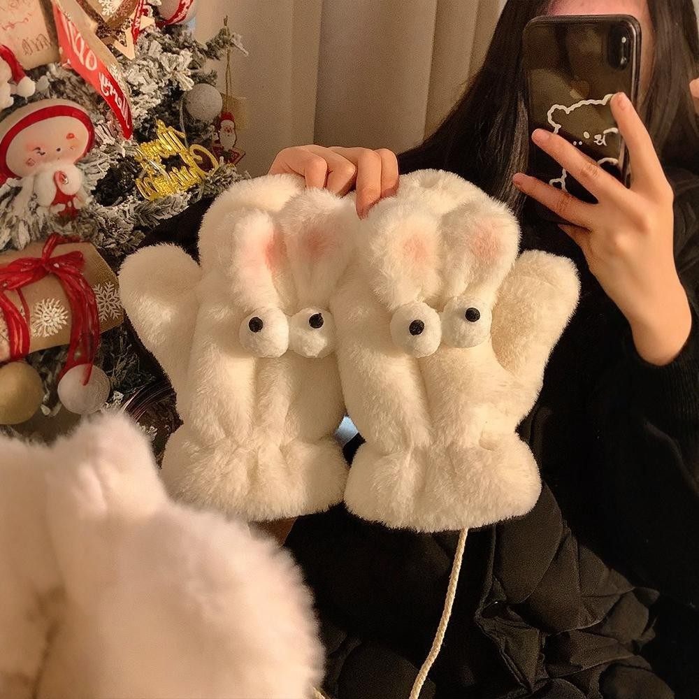mikko联名可爱卡通猫咪毛绒手套女冬季翻盖半指触屏加厚骑行保暖