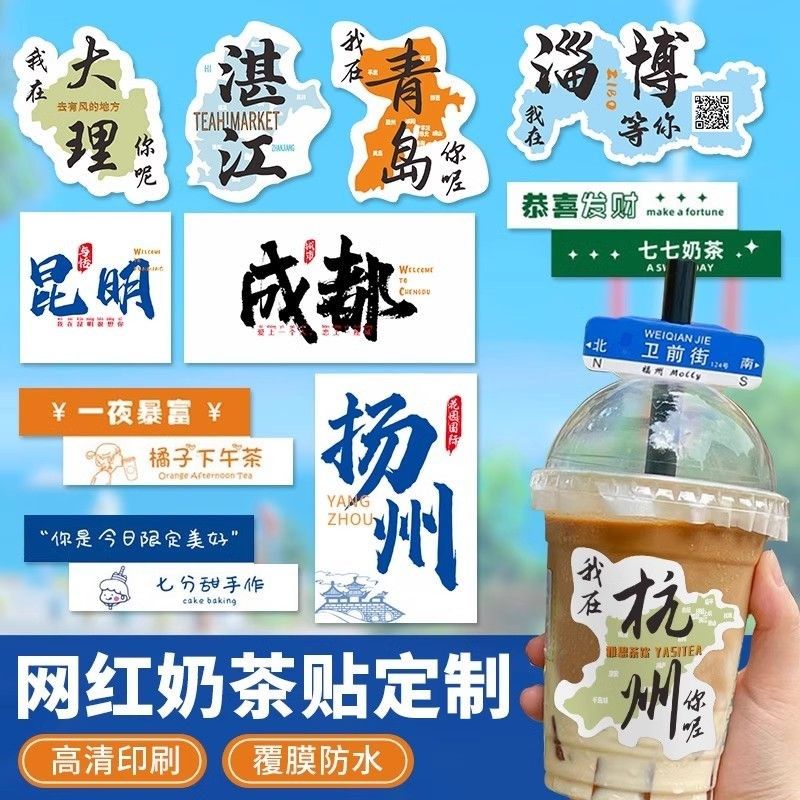 奶茶杯贴纸城市地名定制竹筒饮料防水杯贴网红logo柠檬瓶自粘不干