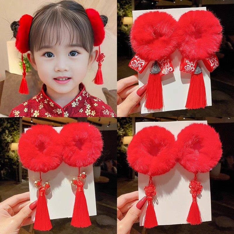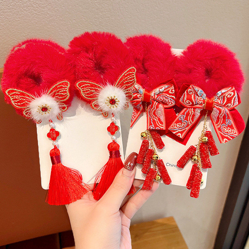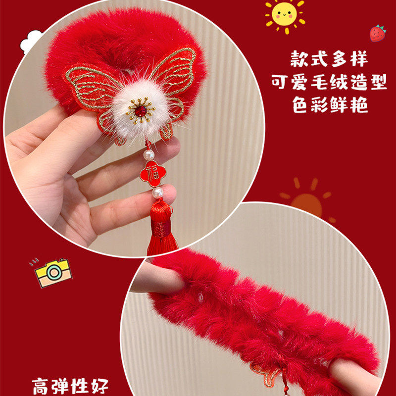 新年儿童头饰古风毛绒发圈喜庆发绳新春红色头绳头花女童过年发饰