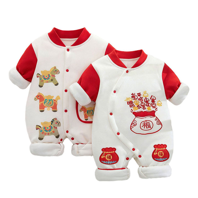 婧麒婴儿连体衣冬季夹棉加厚新生儿爬爬服新年白天哈衣婴幼儿衣服