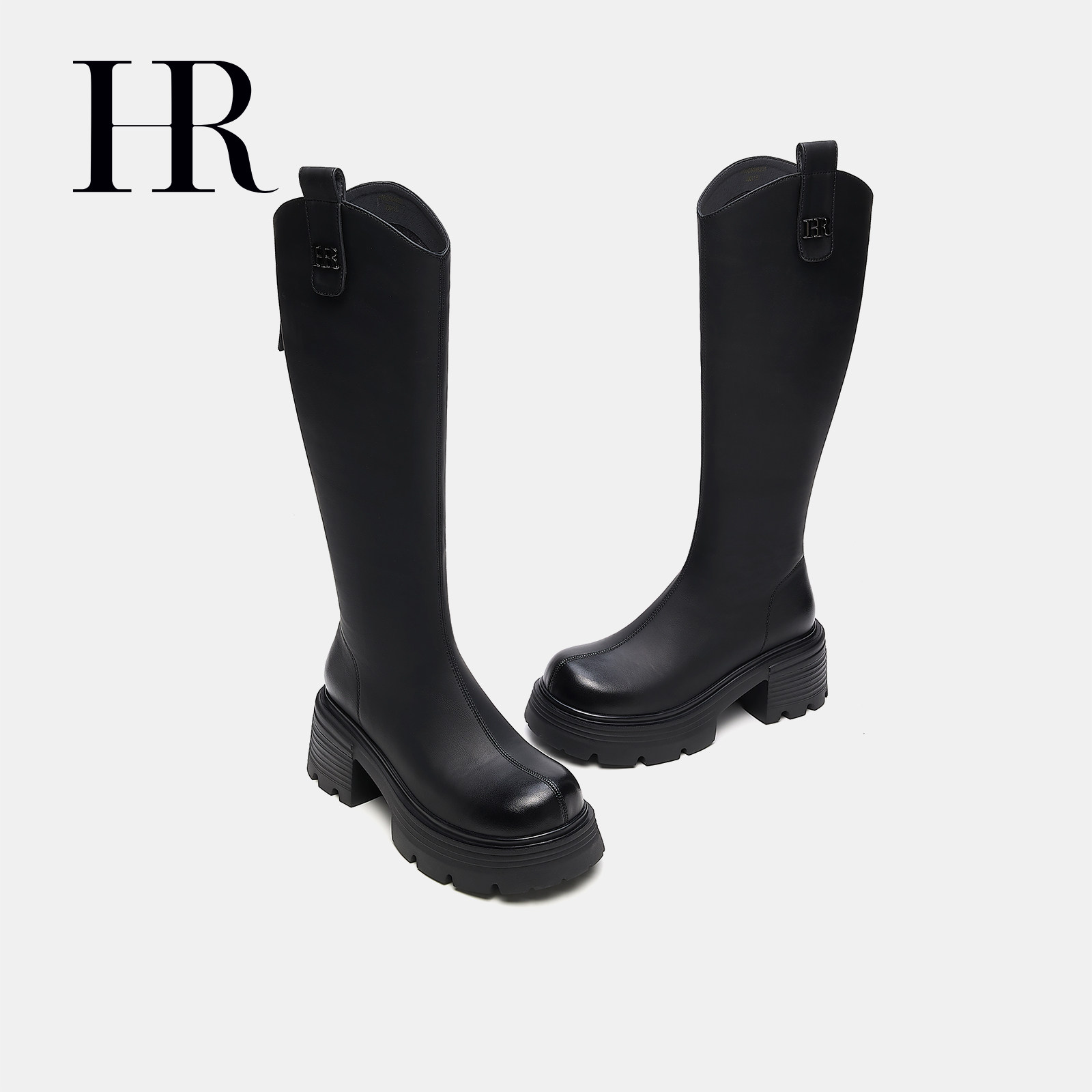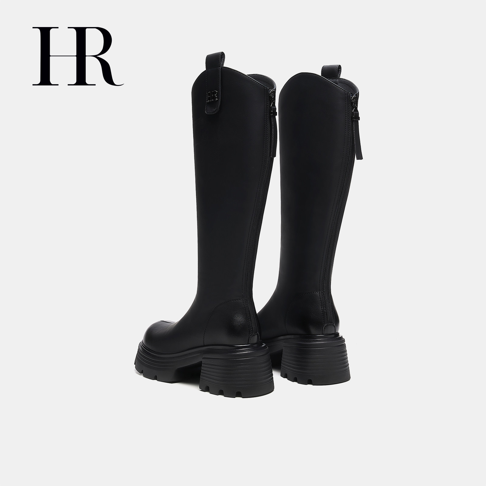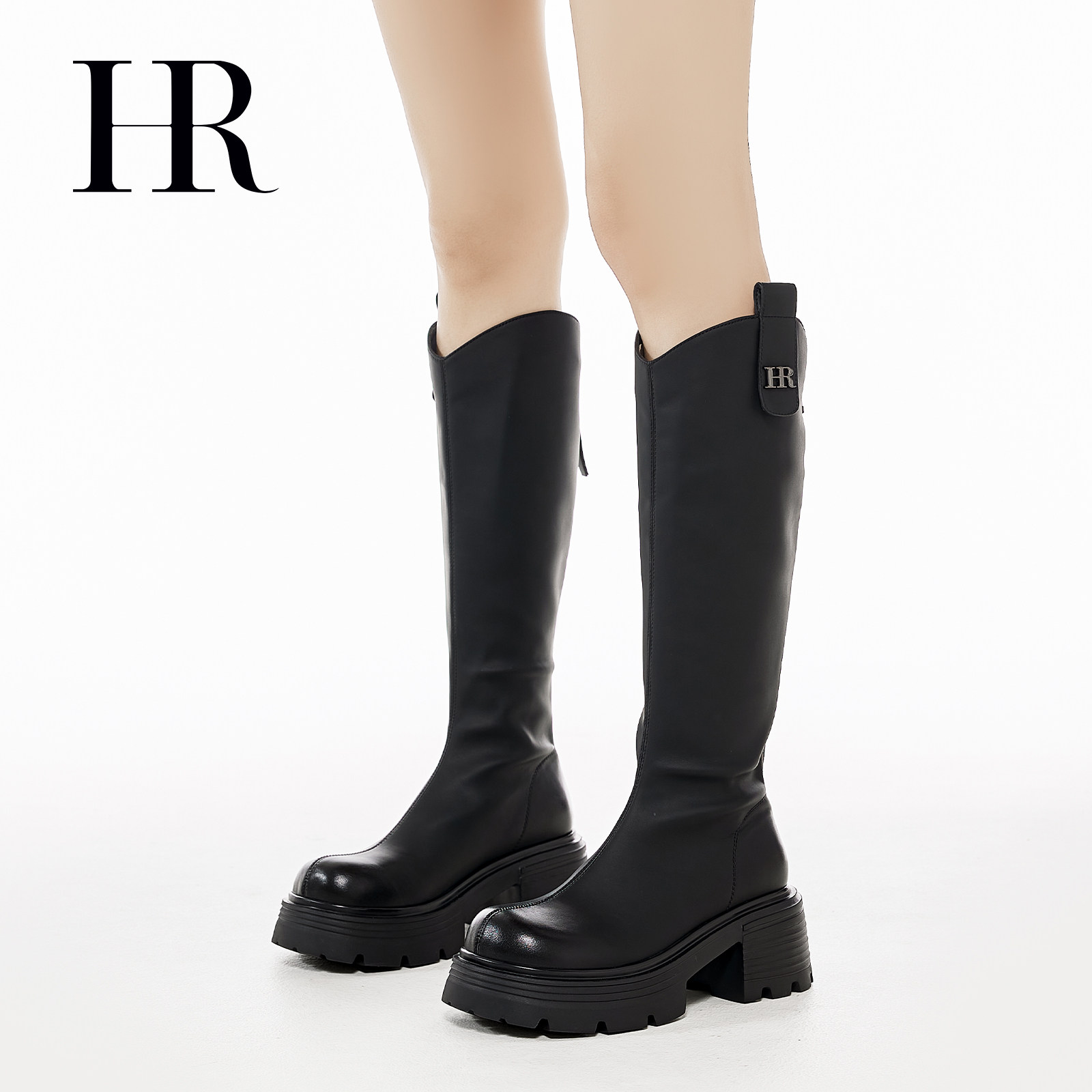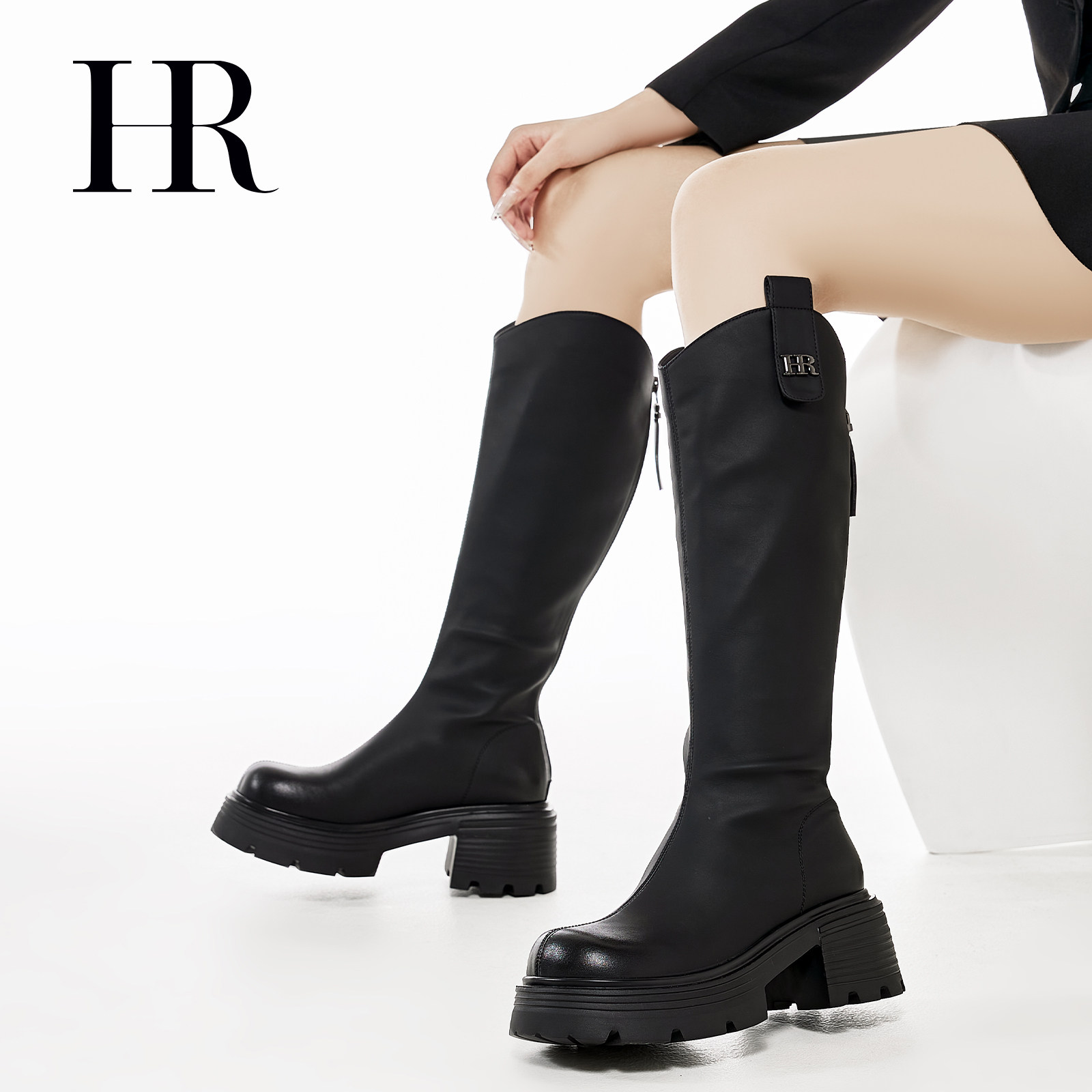 HR赫莲娜女鞋子2025冬季新款骑士靴粗跟时尚显瘦后拉链长筒靴增高