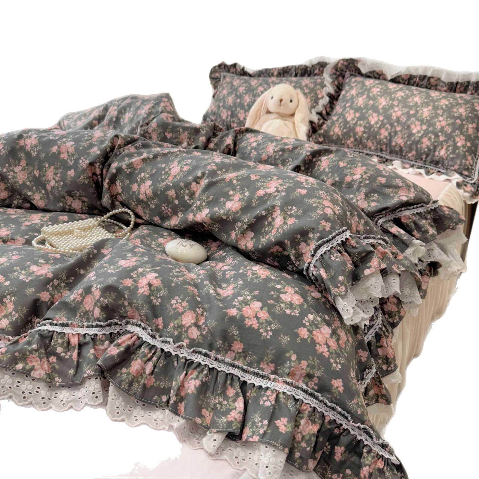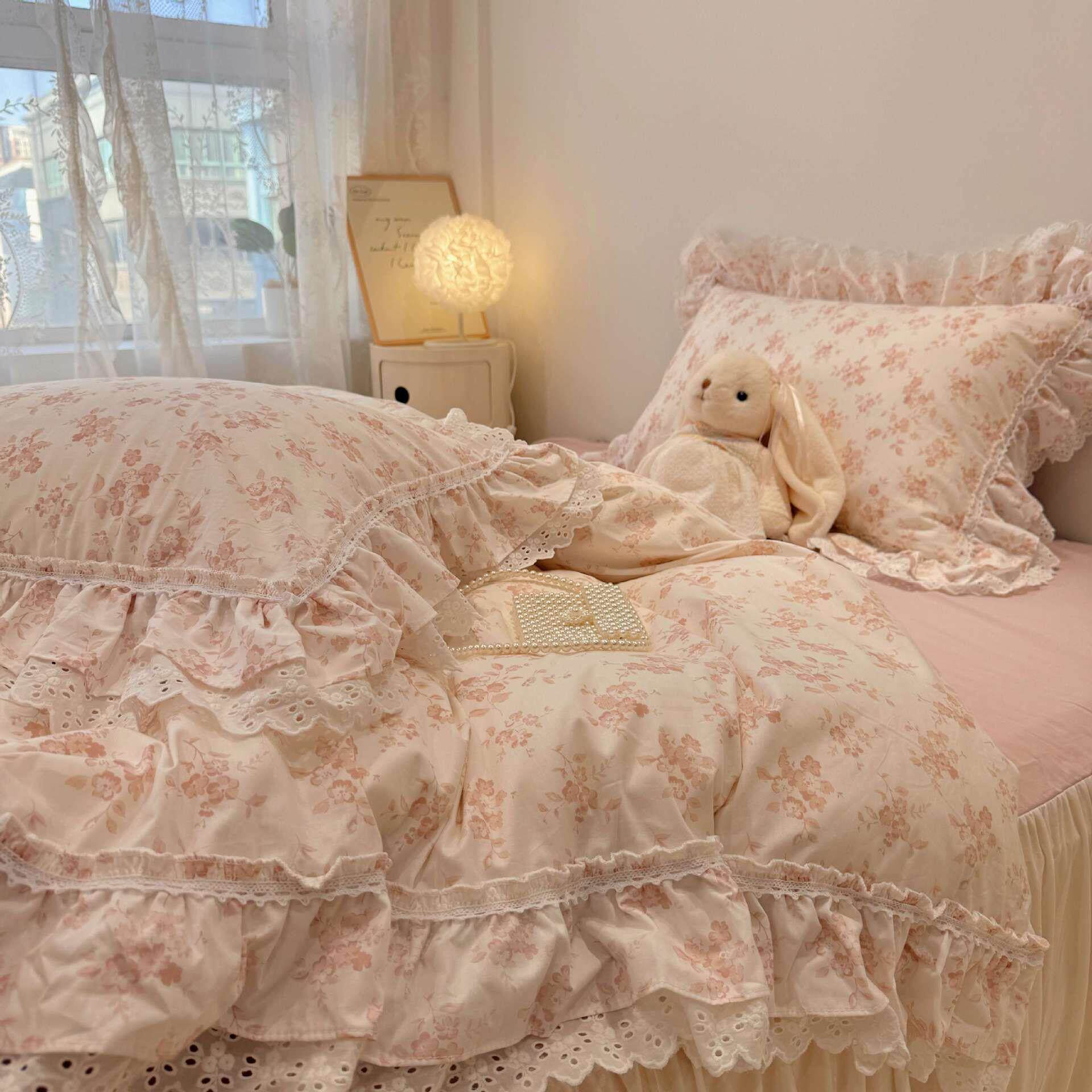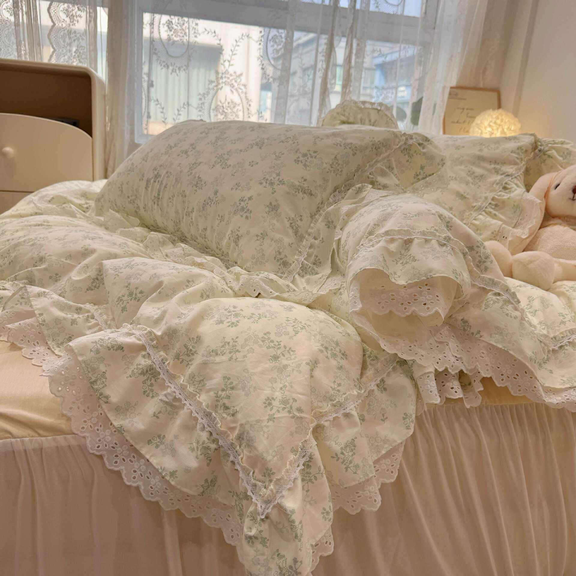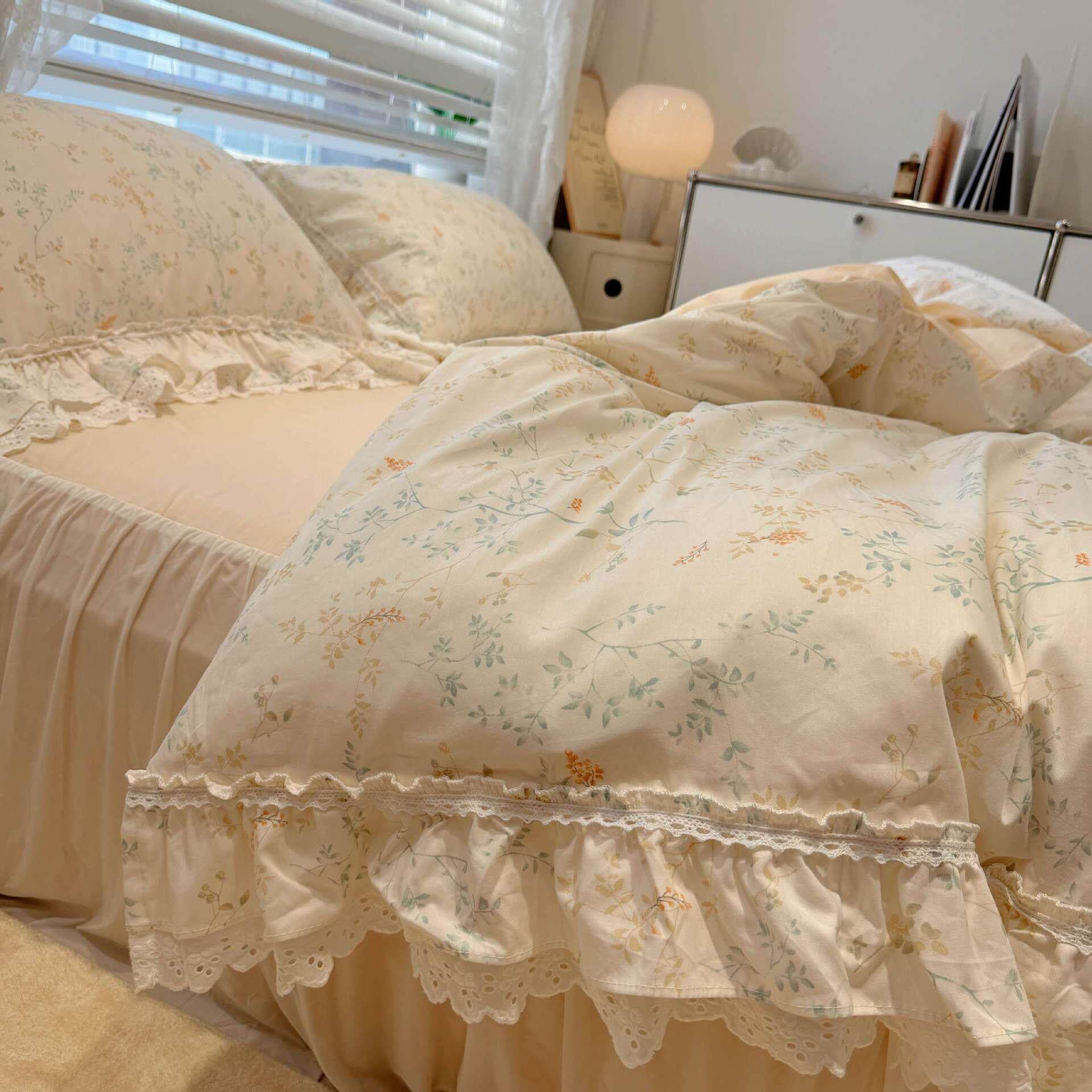 韩系荷叶花边纯棉四件套全棉清新少女心被套床品床裙床笠亲肤裸睡