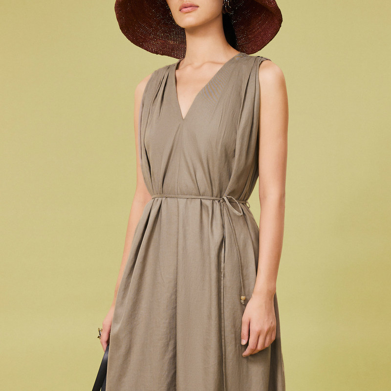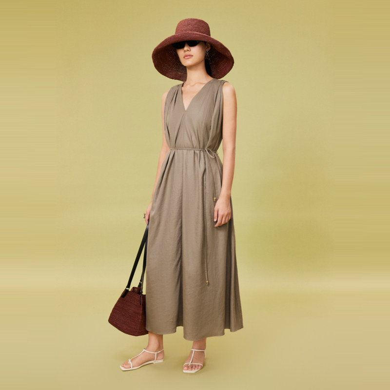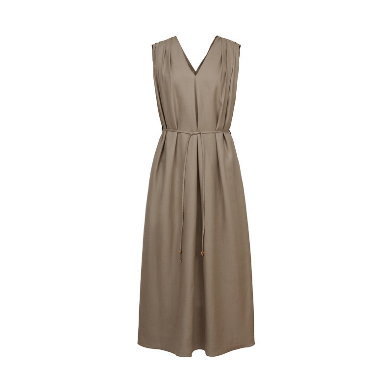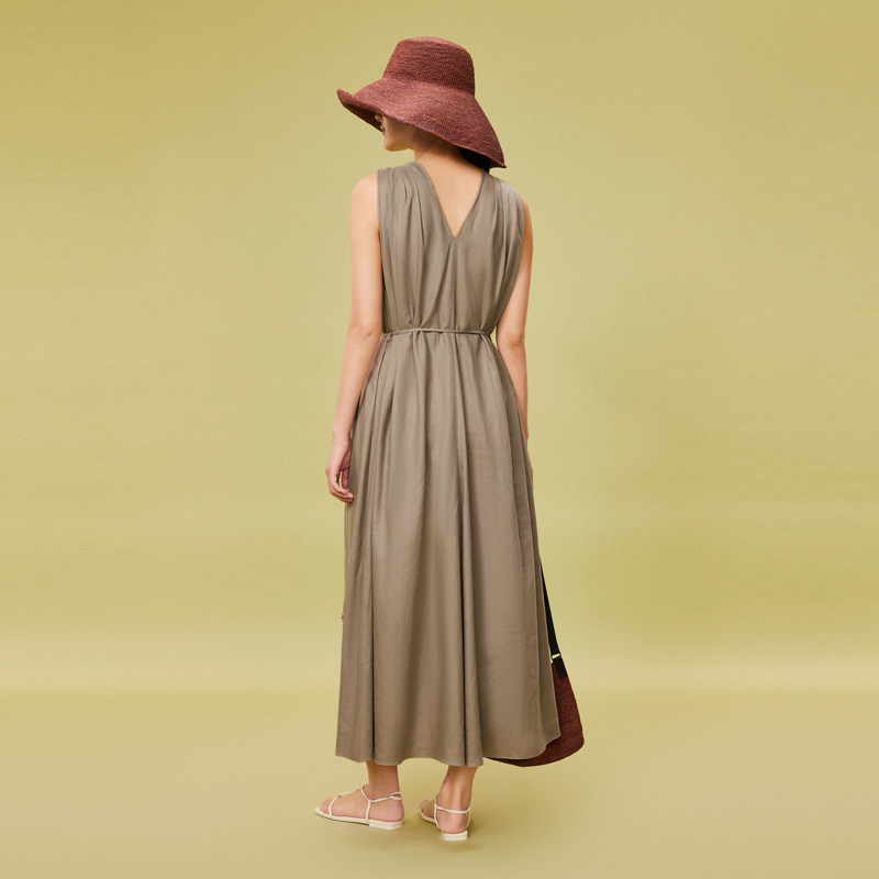 LESS夏季休闲简约无袖莱赛尔连衣裙时尚V领系带通勤长裙2O6G11990