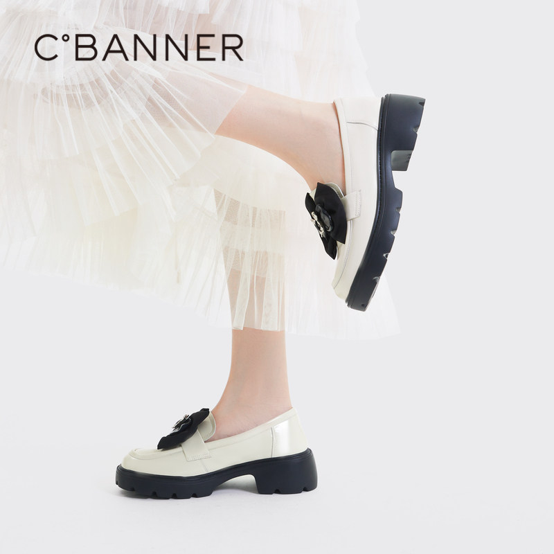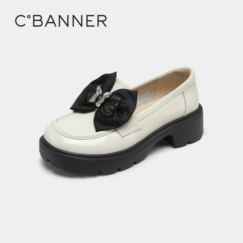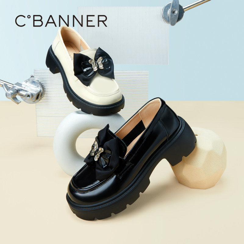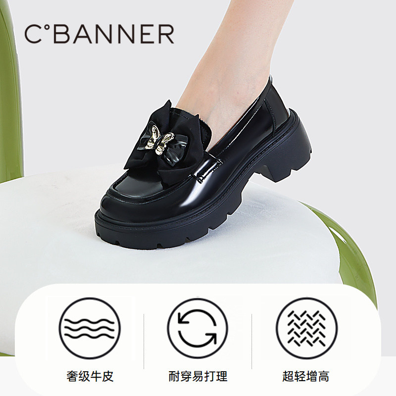 千百度女鞋秋季新款厚底乐福鞋蝴蝶结豆豆鞋小皮鞋真皮增高