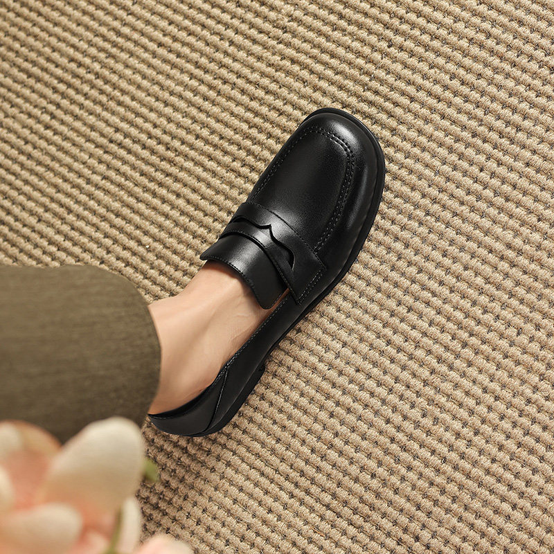 阿么手工女鞋2025新款圆头乐福鞋百搭英伦风时尚软底黑色小皮鞋女