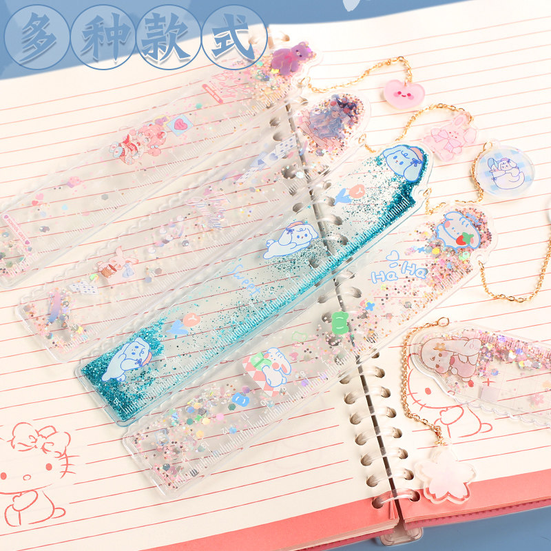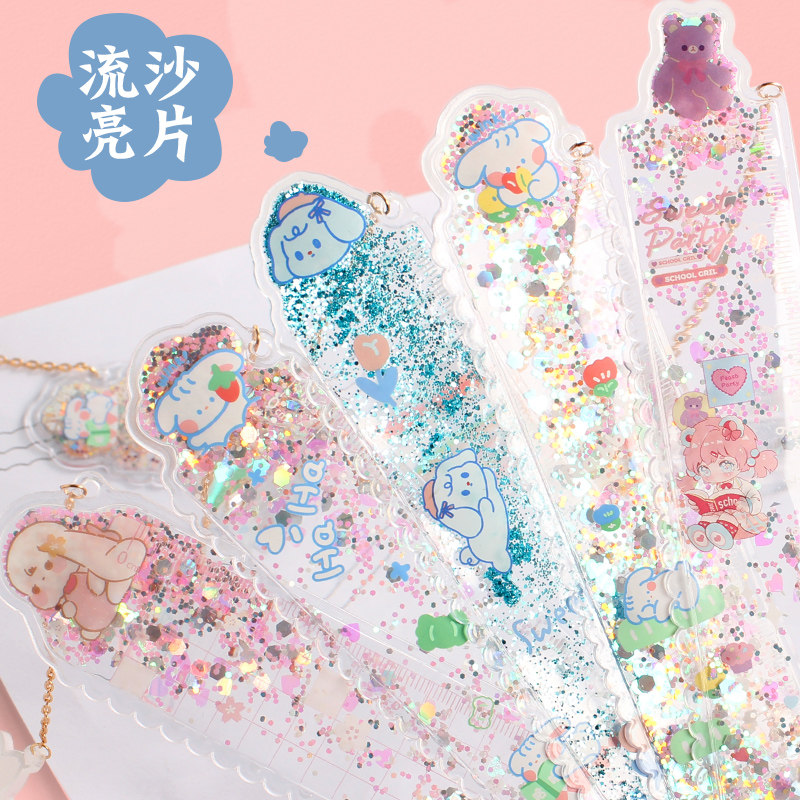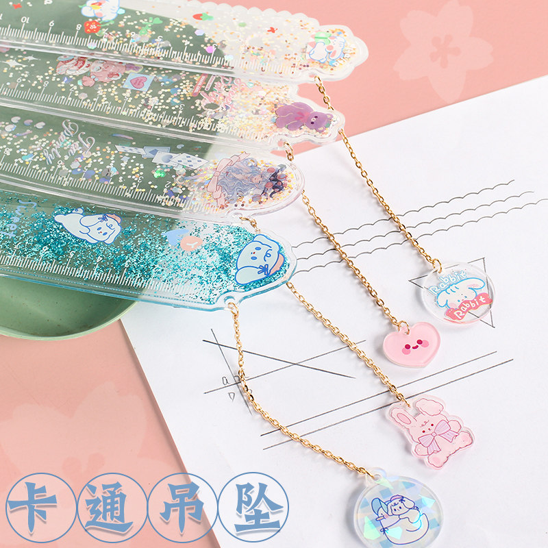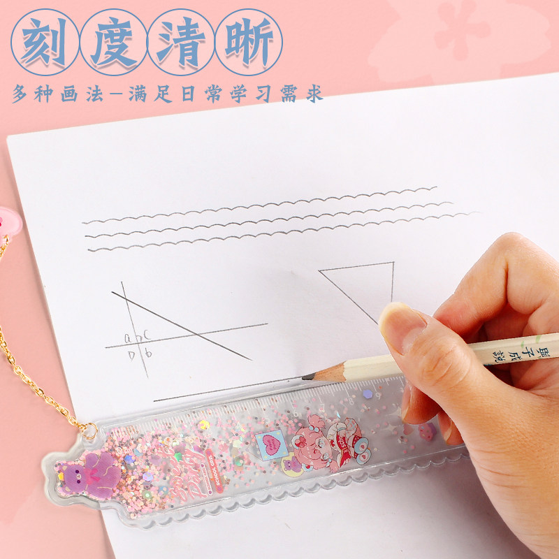 新款创意卡通入油书签尺女孩15cm流沙尺带波浪线直尺子少女心小学生用吊坠书签刻度尺网红流沙液体测量工具尺