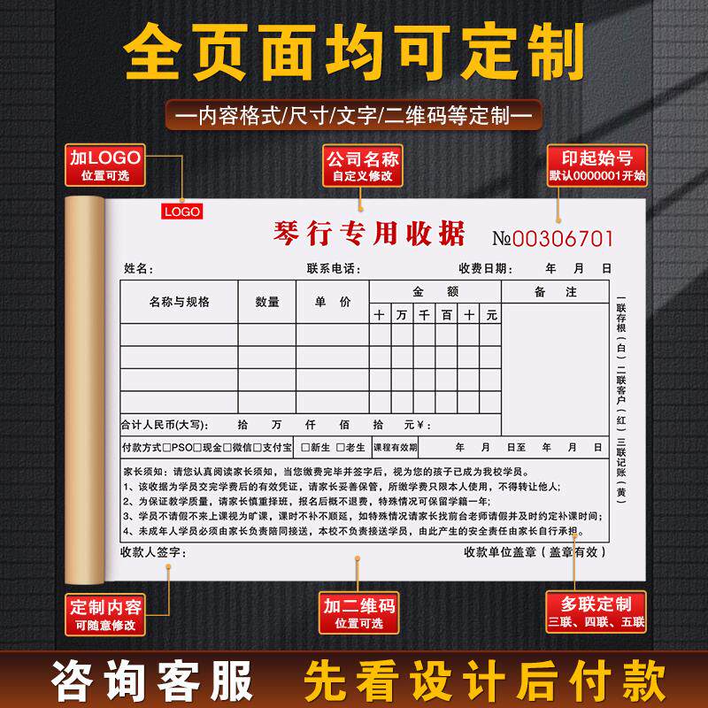 【琴行培训专用】收款收据二联钢琴课程古筝吉它乐器入学报名协议