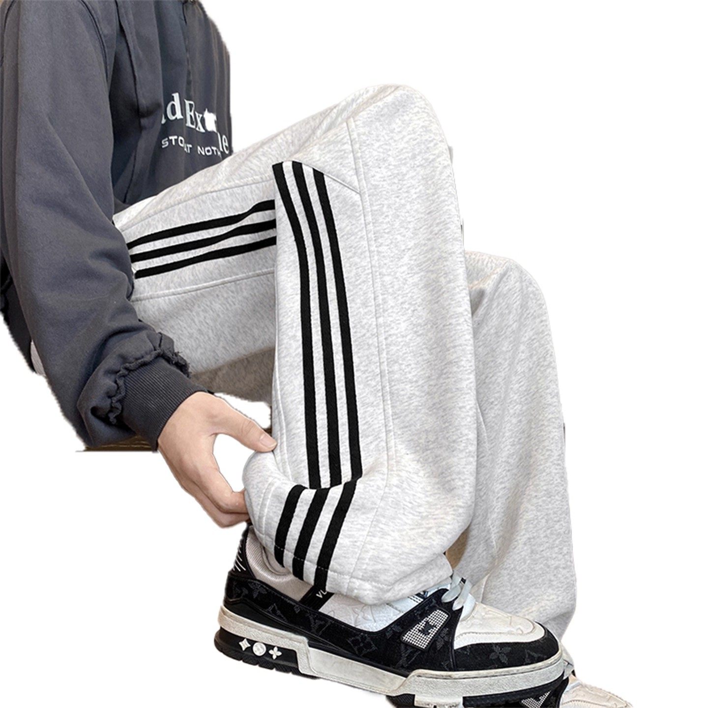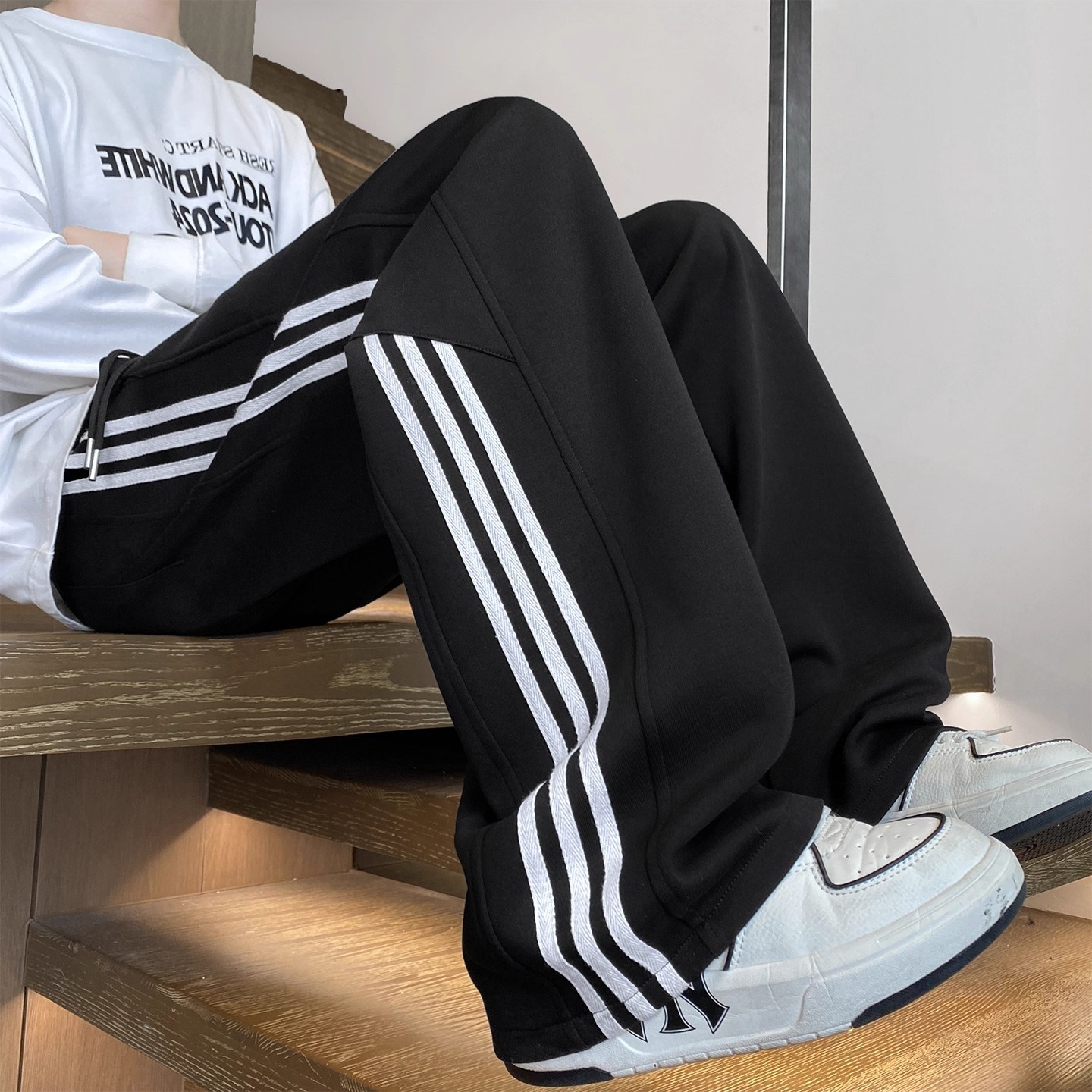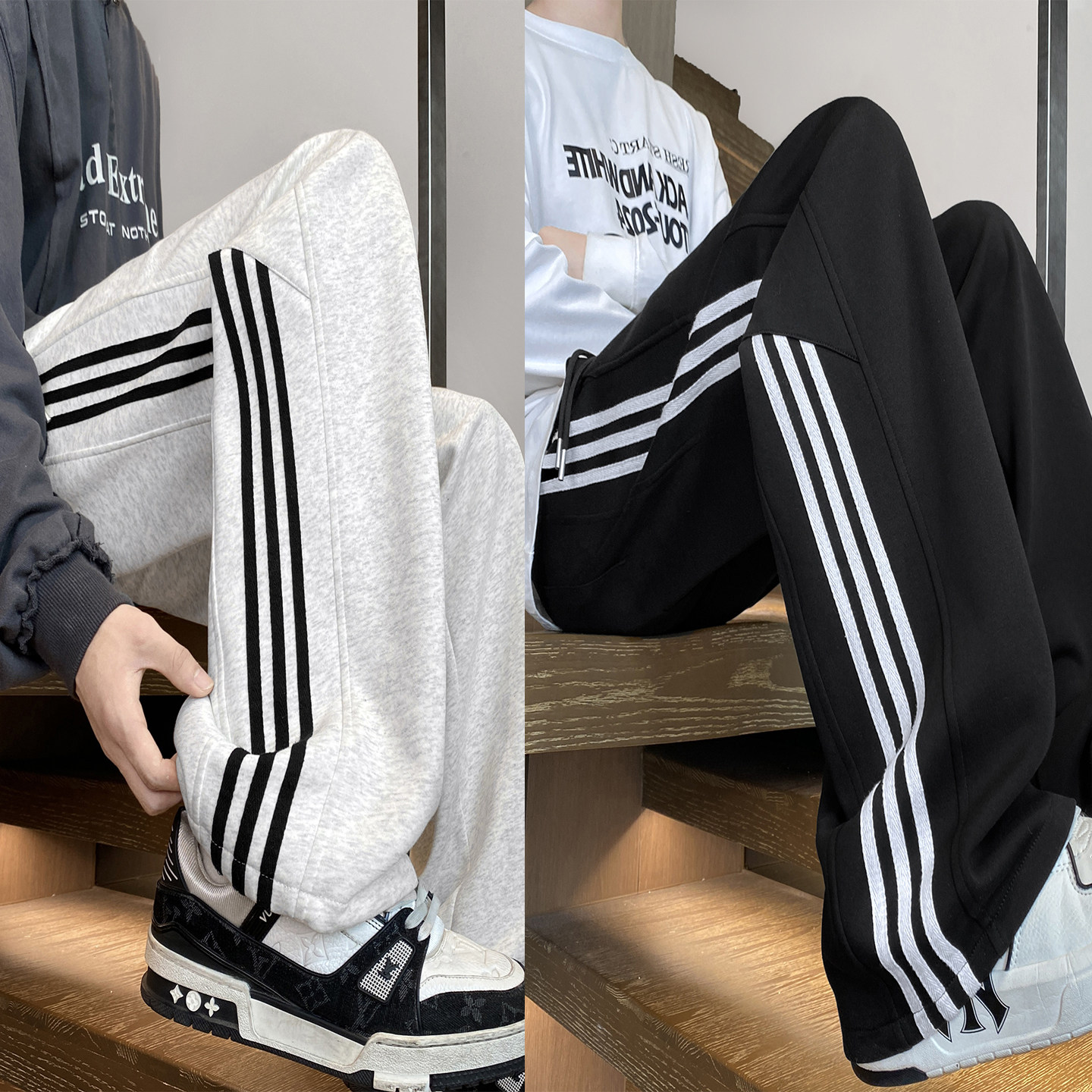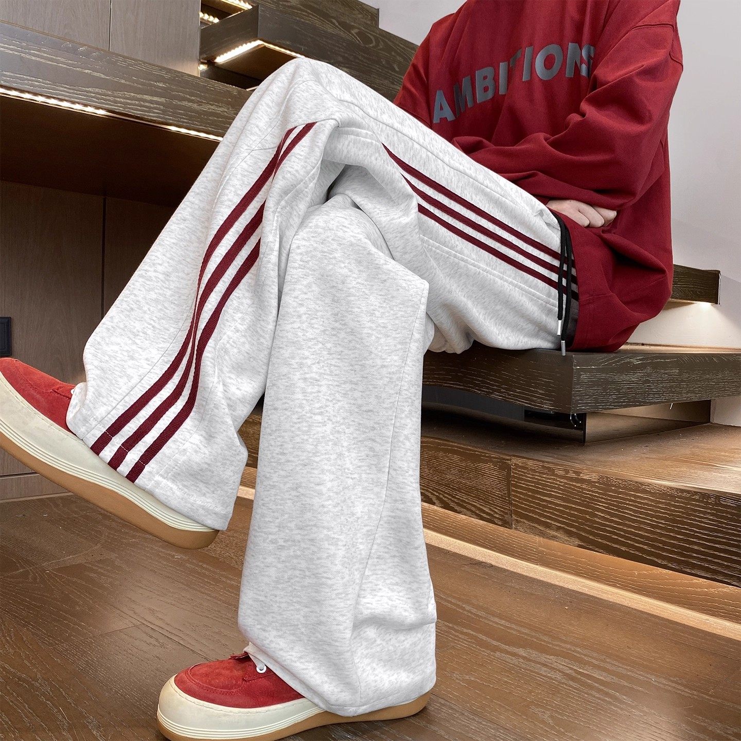 白灰条纹卫裤男秋冬加绒潮牌美式重磅休闲长裤宽松直筒加绒运动裤
