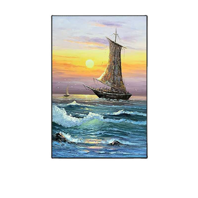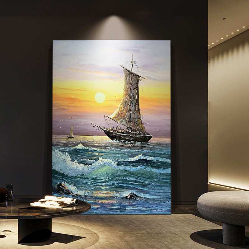 纯手绘油画轻奢玄关装饰画后现代日出挂画海上帆船壁画大幅落地画