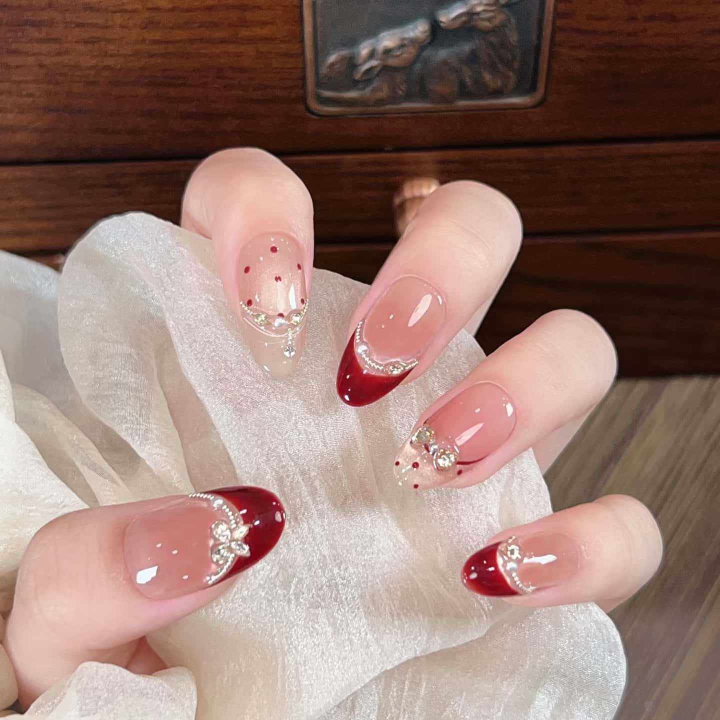 纯欲猫眼半手工穿戴甲短款美甲贴片裸色丝绸指甲法式圣诞红色蓝色