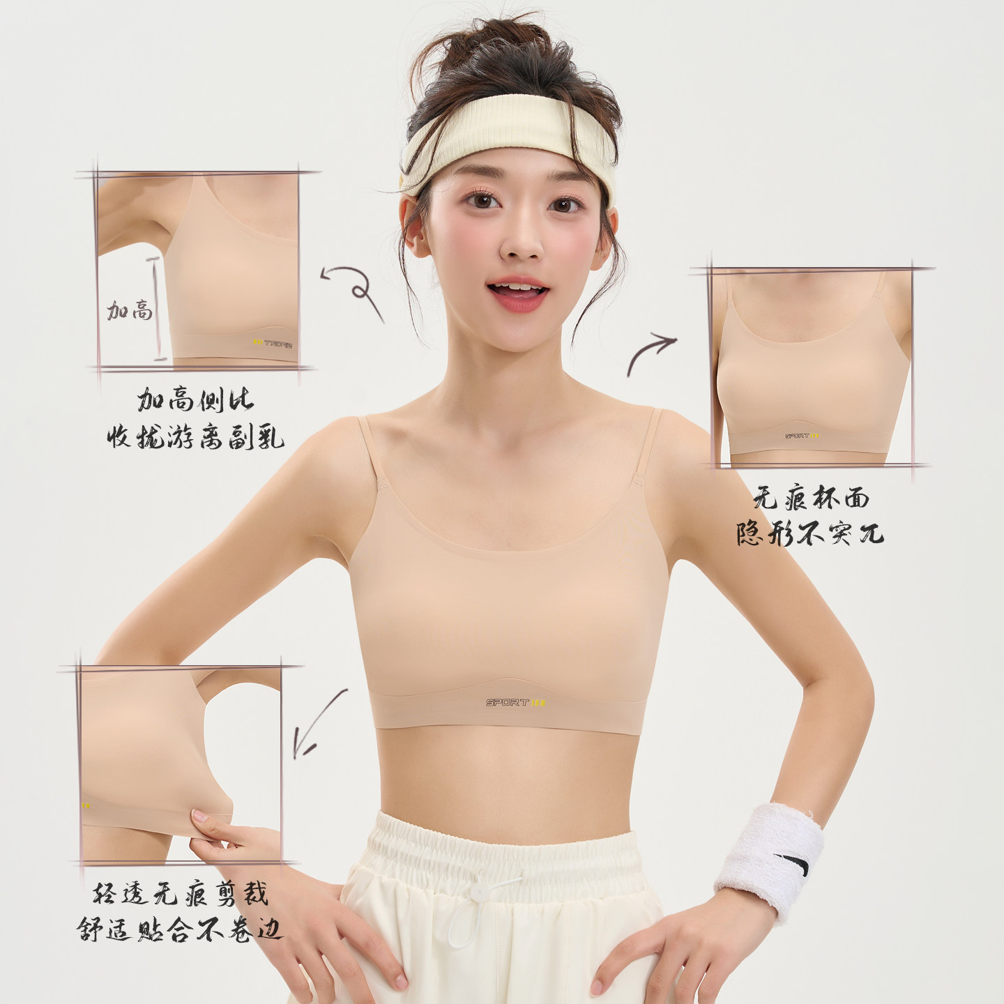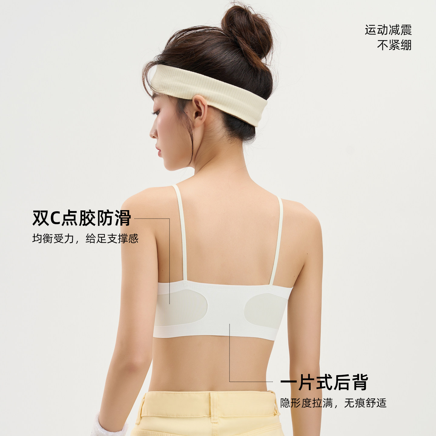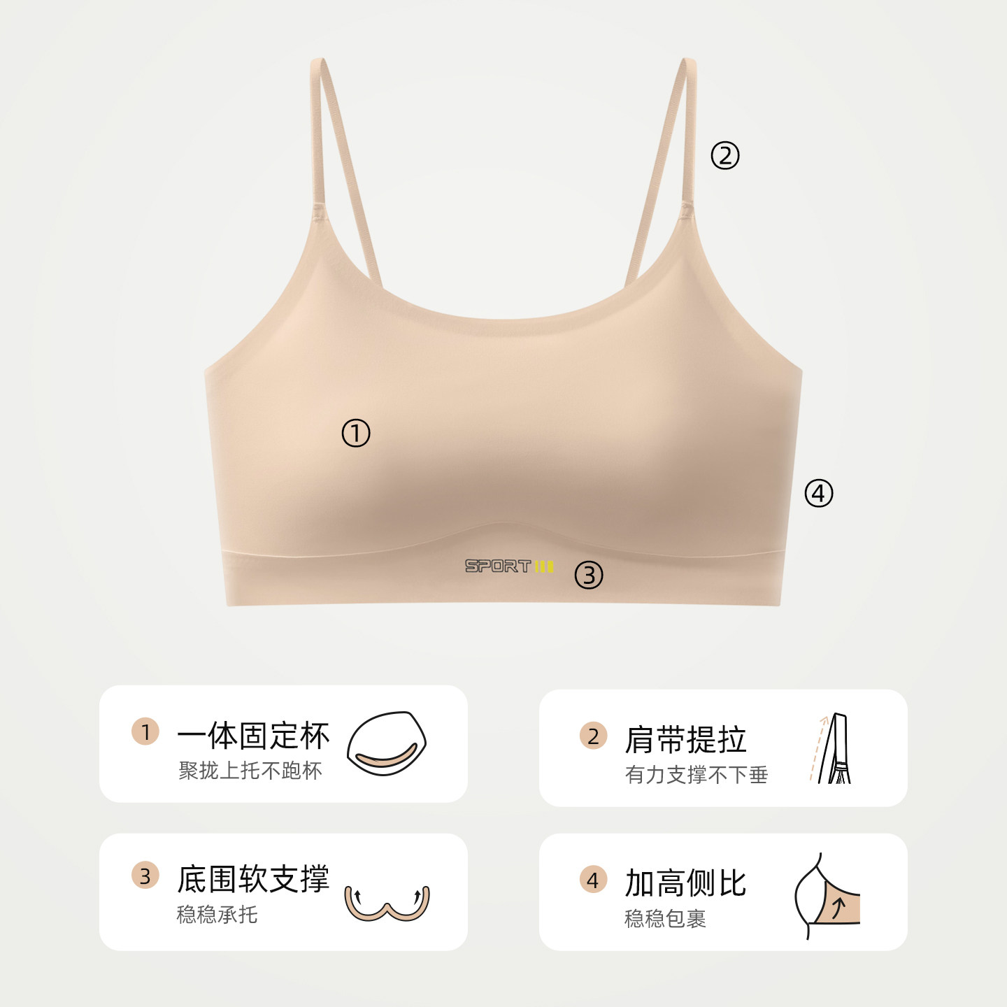 无钢圈软支撑+立体胸垫+宽边弹力下摆