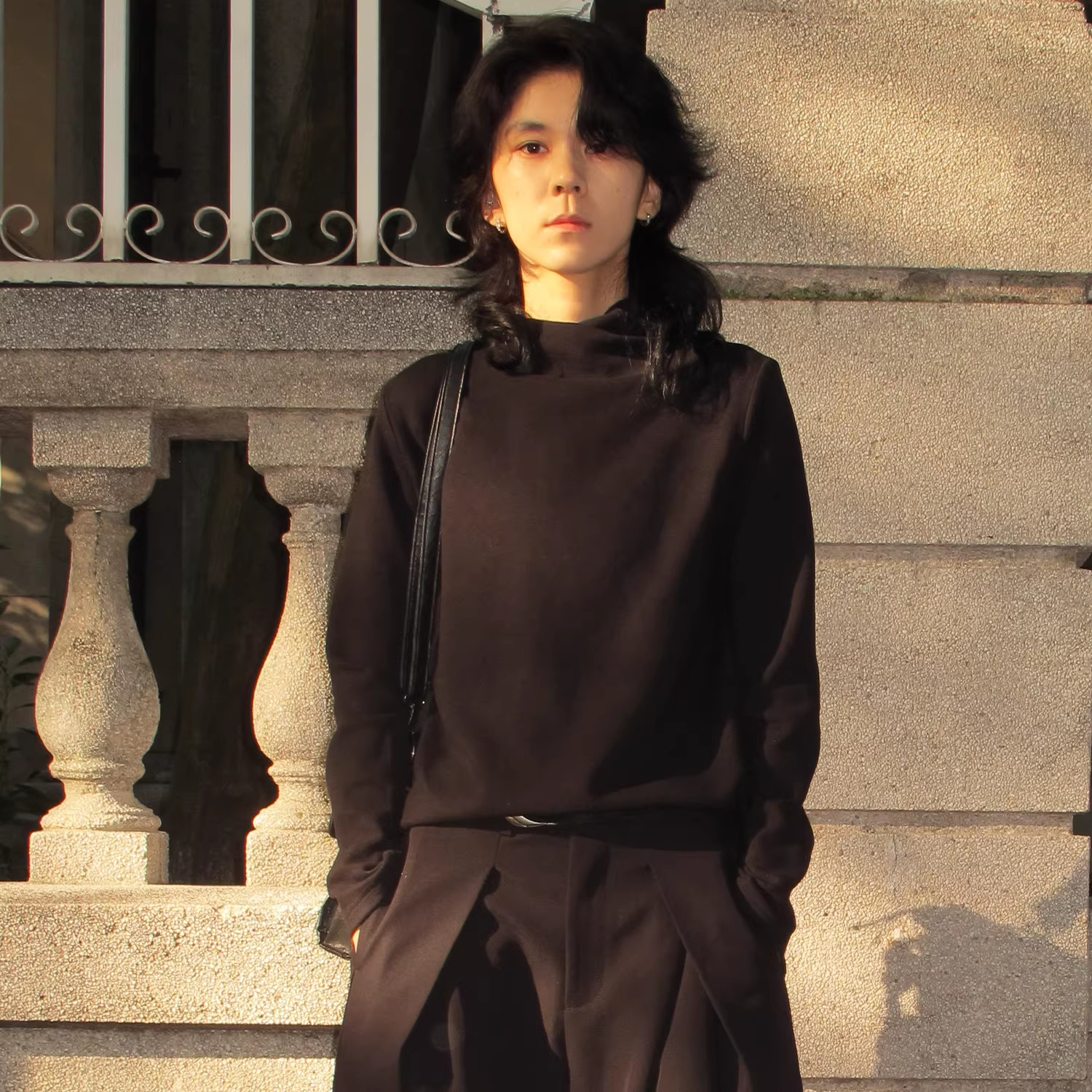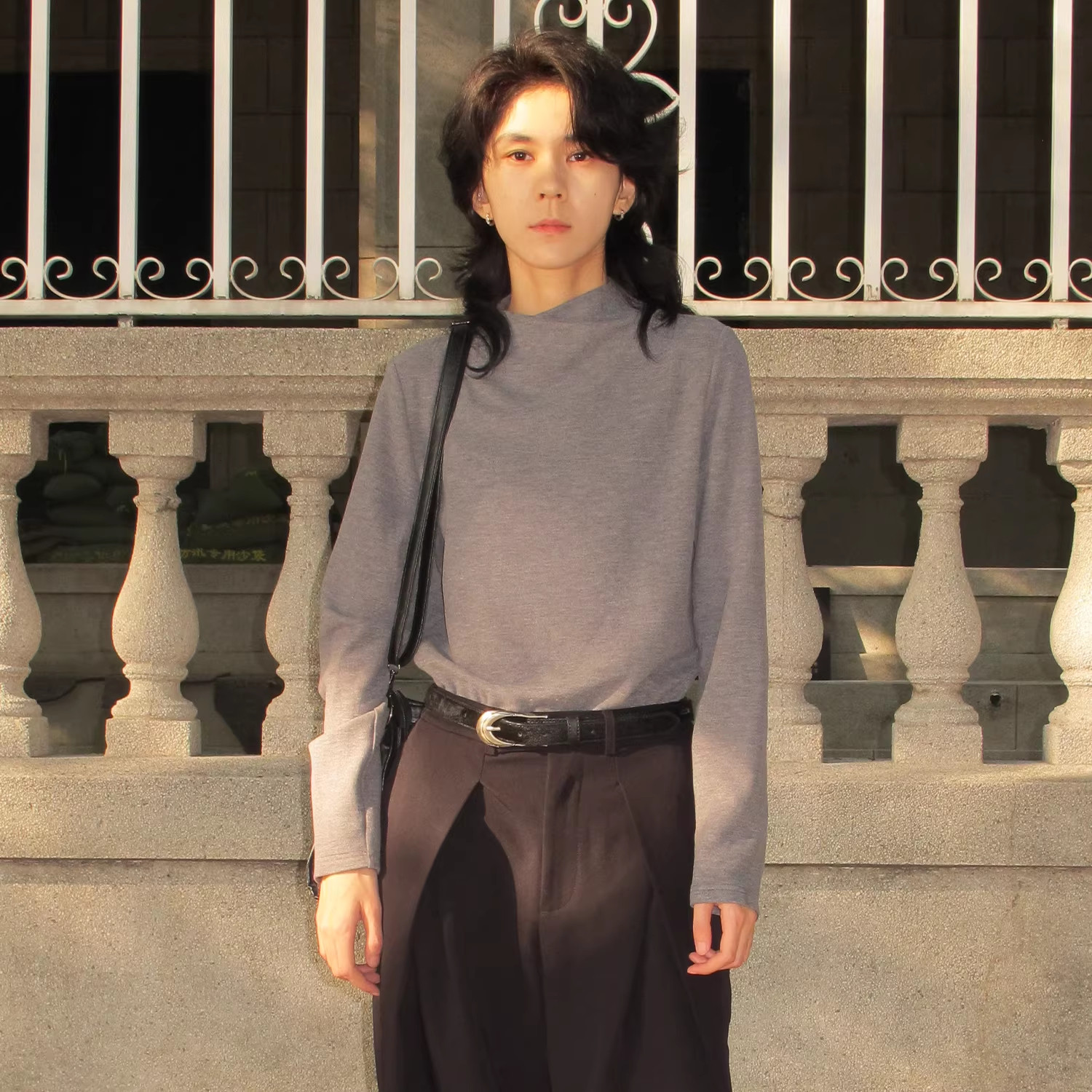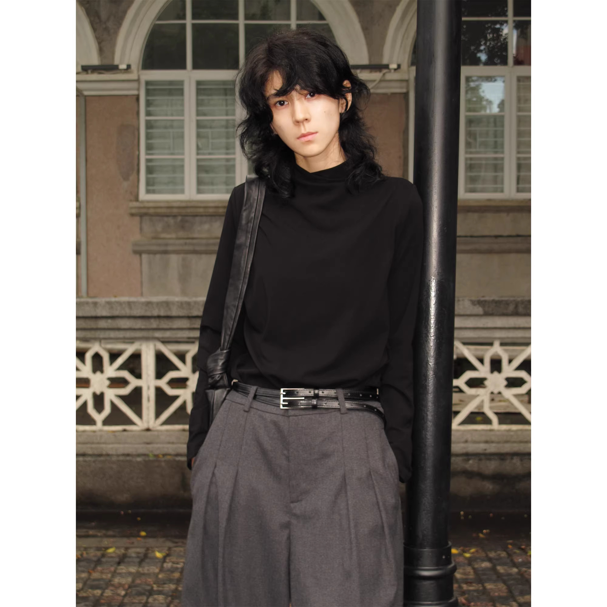sameuoo烟囱领中性风纯色正肩长袖T恤极简高级肌理感针织显瘦上衣