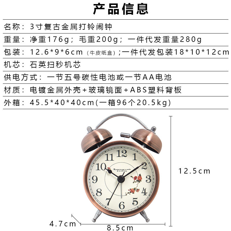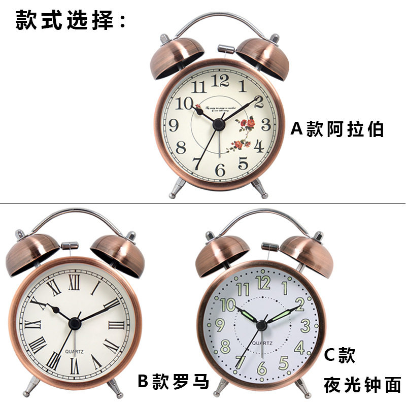 北欧复古金属闹钟儿童静音时英台钟桌面简约学生卧室夜光钟表批发