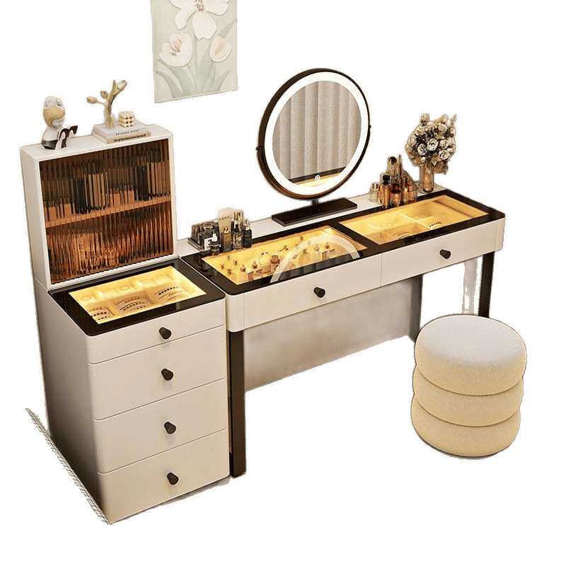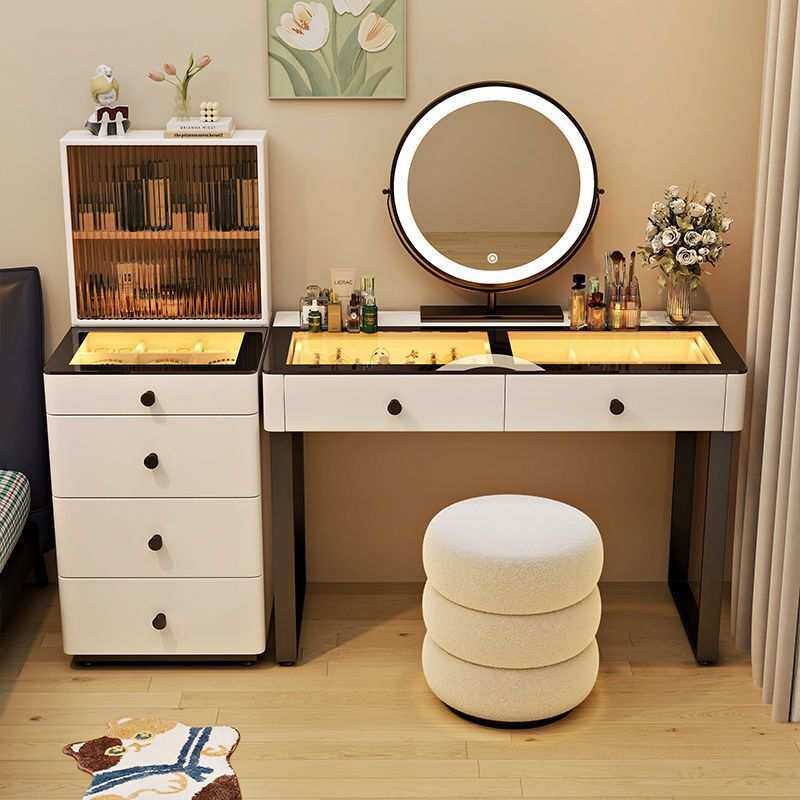 爆款奶油风全实木梳妆台现代简约桌斗柜收纳一体全景氛围灯