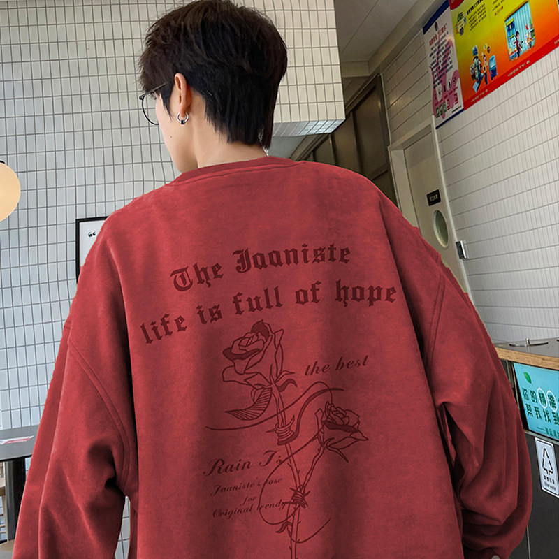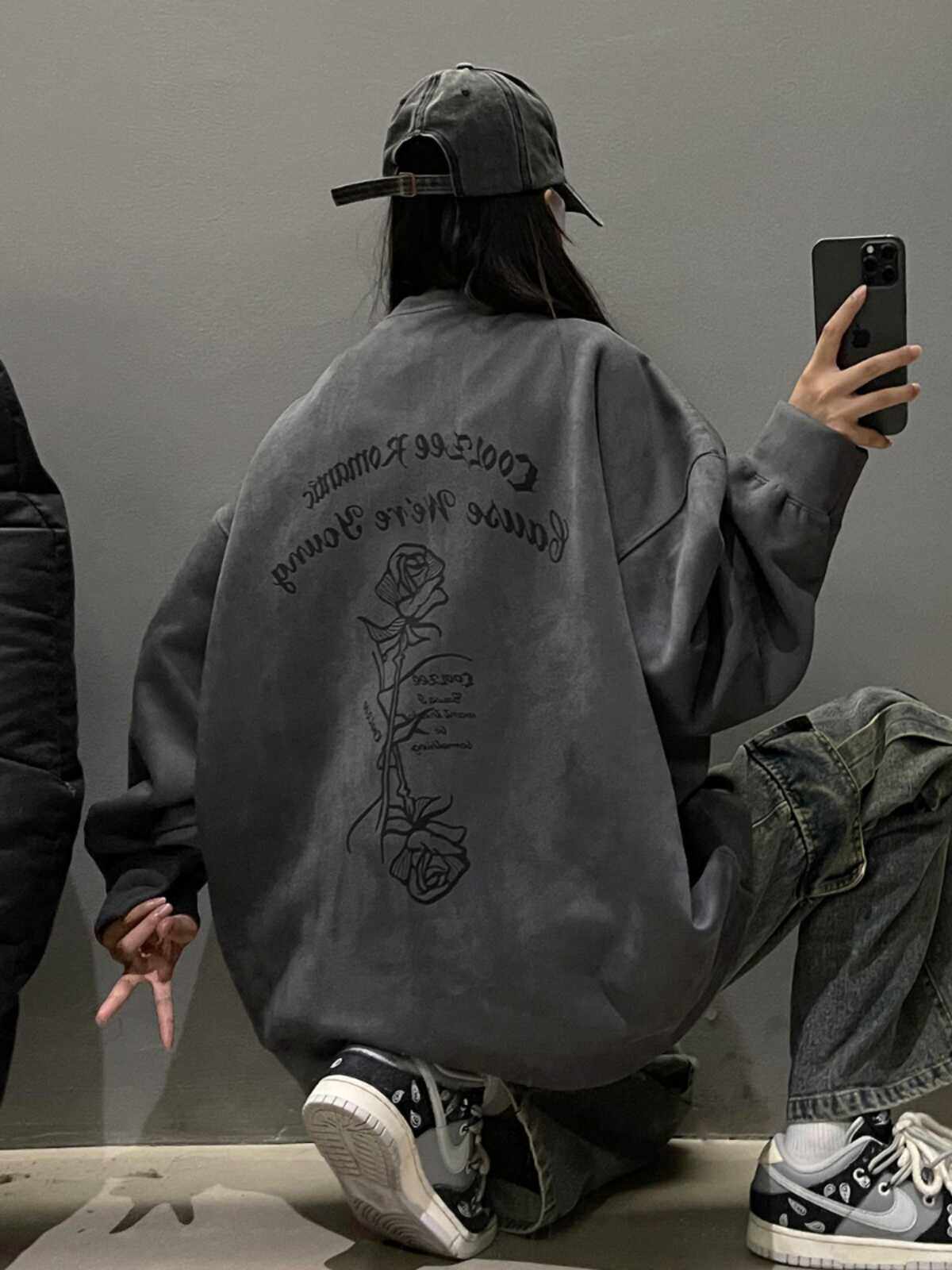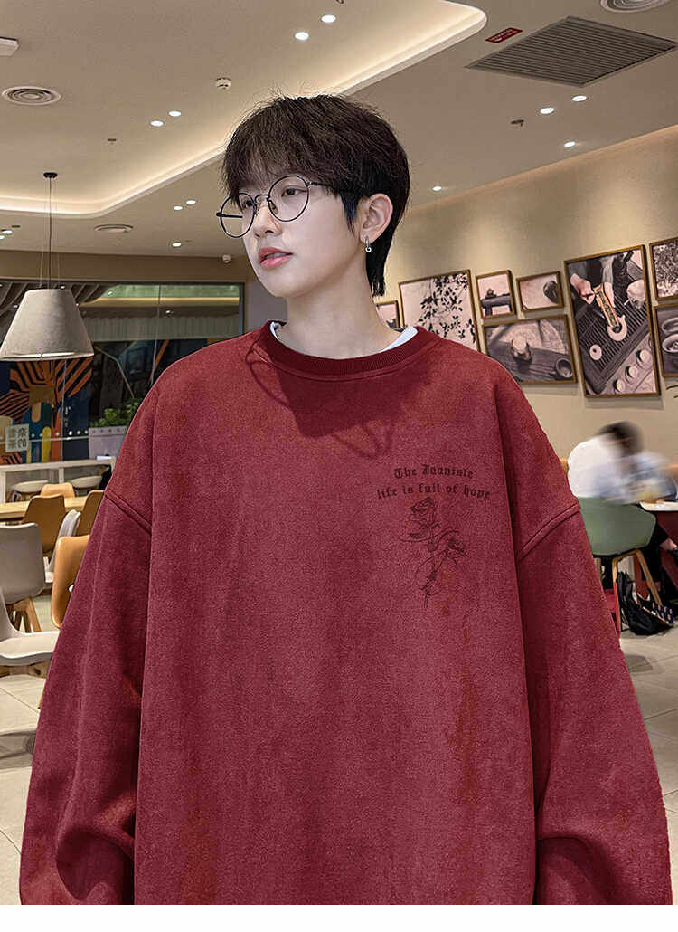 玫瑰麂皮美式潮牌无帽圆领卫衣男2025春秋新款复古上衣外套内搭男