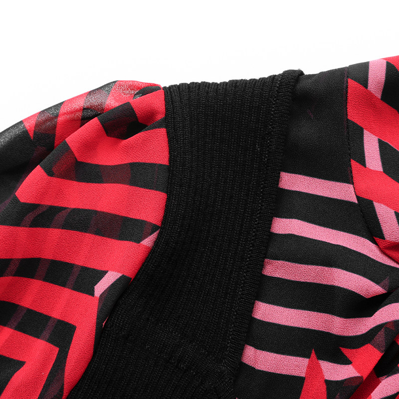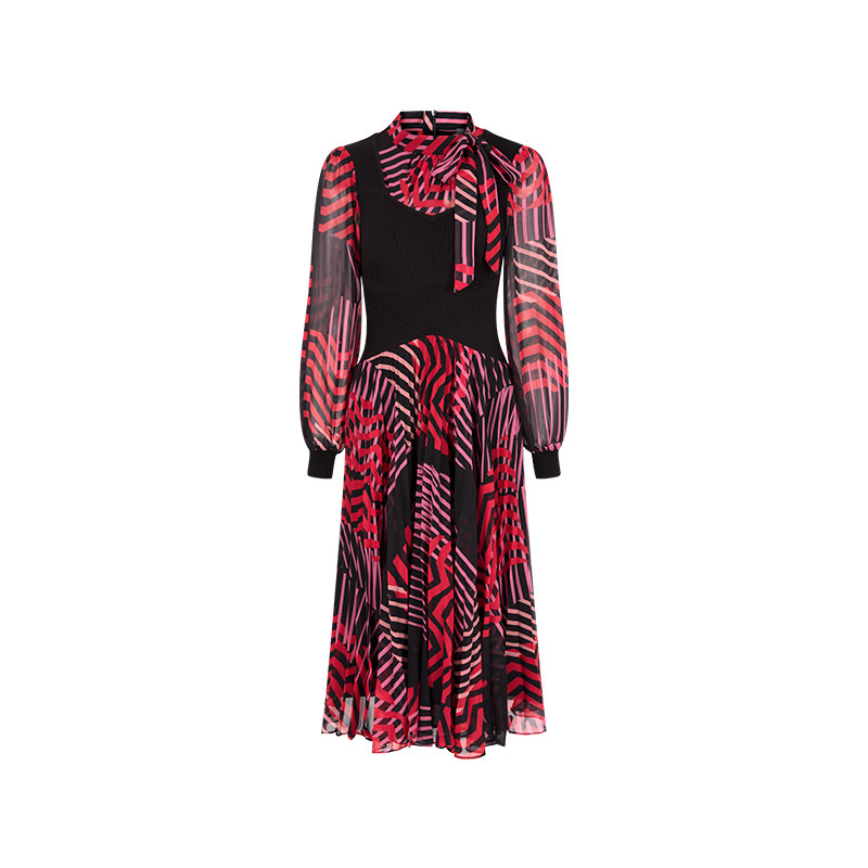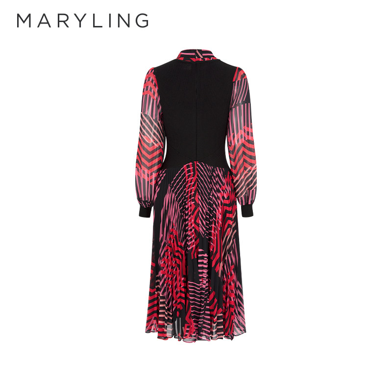 MARYLING玛俪琳秋新品红色飘带小立领中长裙针梭织拼接条纹连衣裙