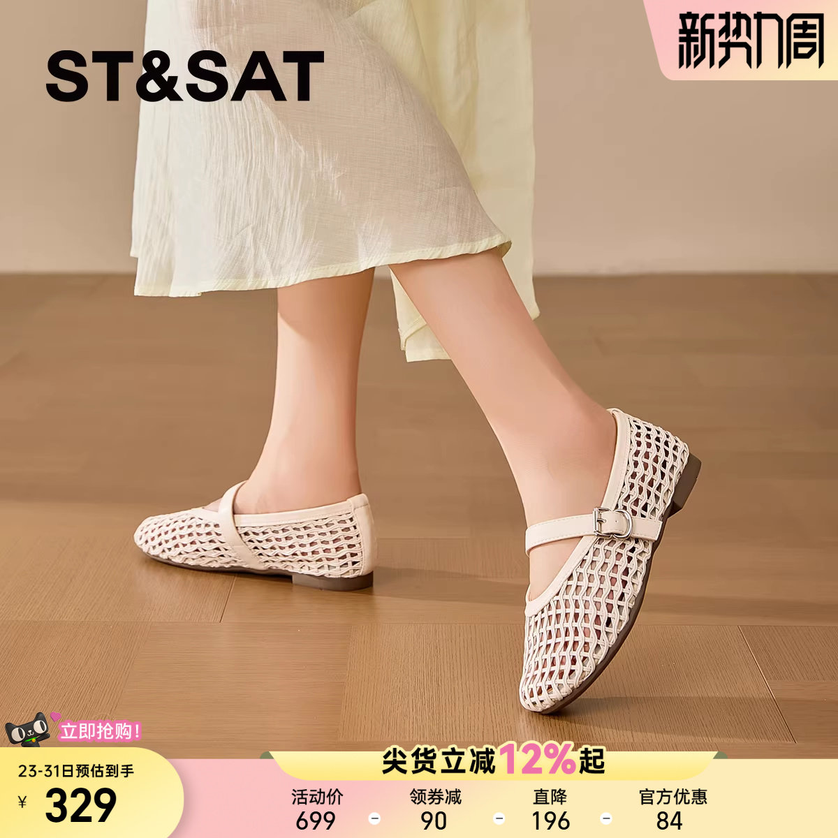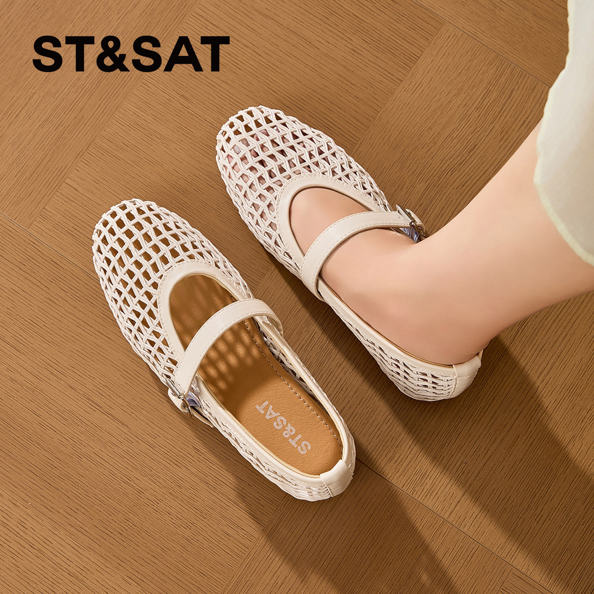 星期六镂空玛丽珍鞋女款2026新款平底编织浅口单鞋一字带扣凉鞋女