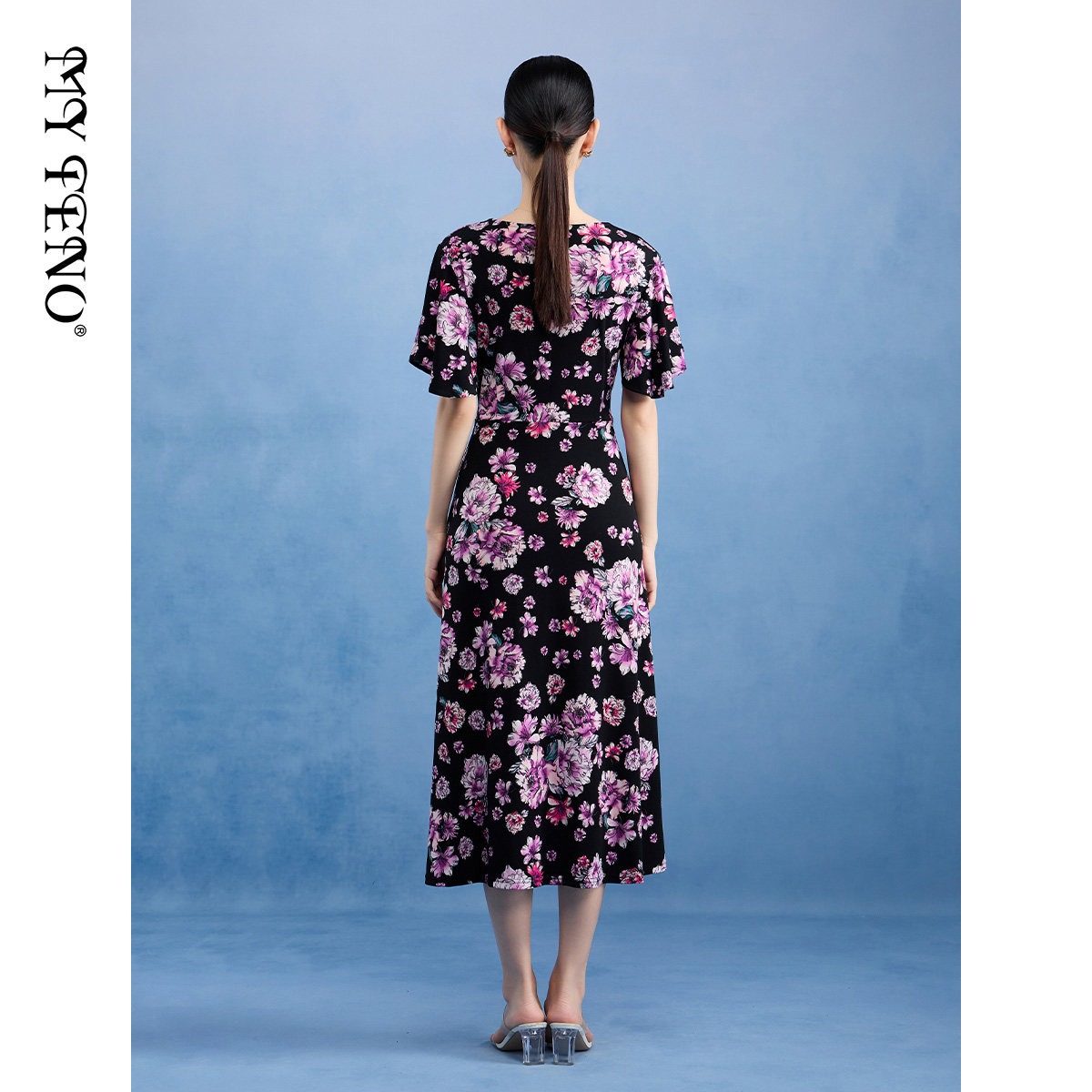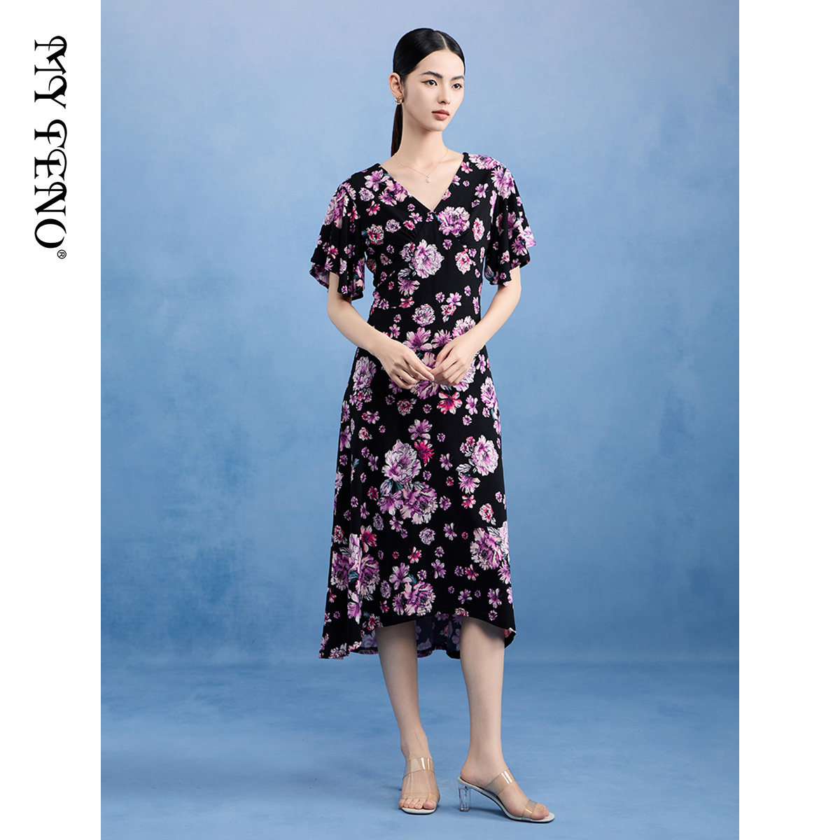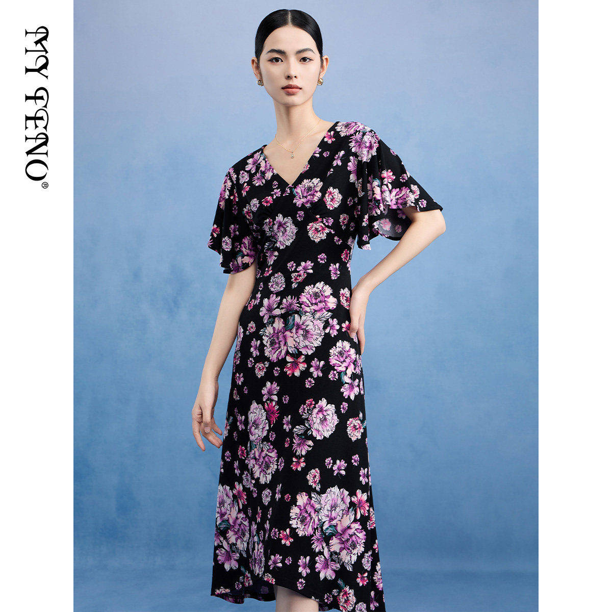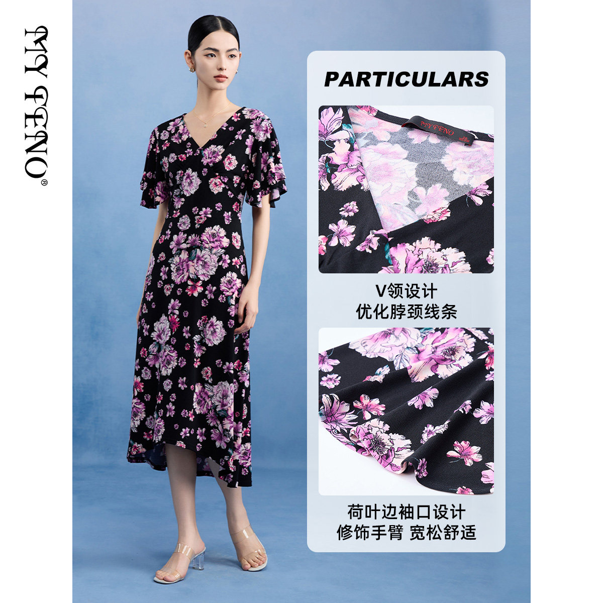 马天奴女装夏季新款黑色V领印花法式连衣裙收腰长裙气质时尚裙子