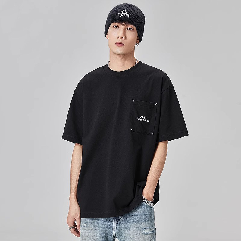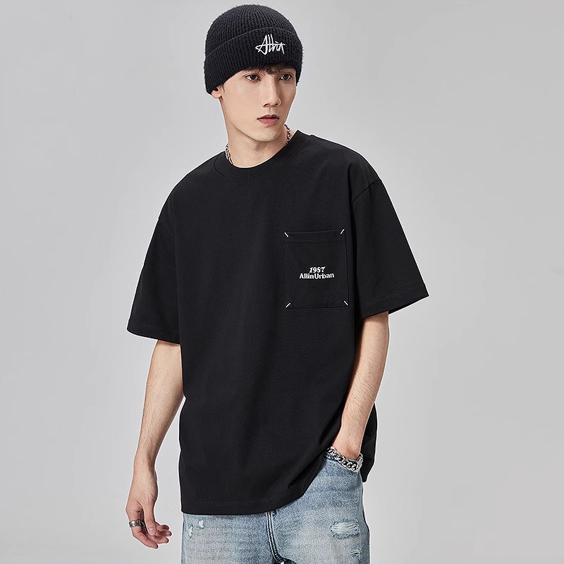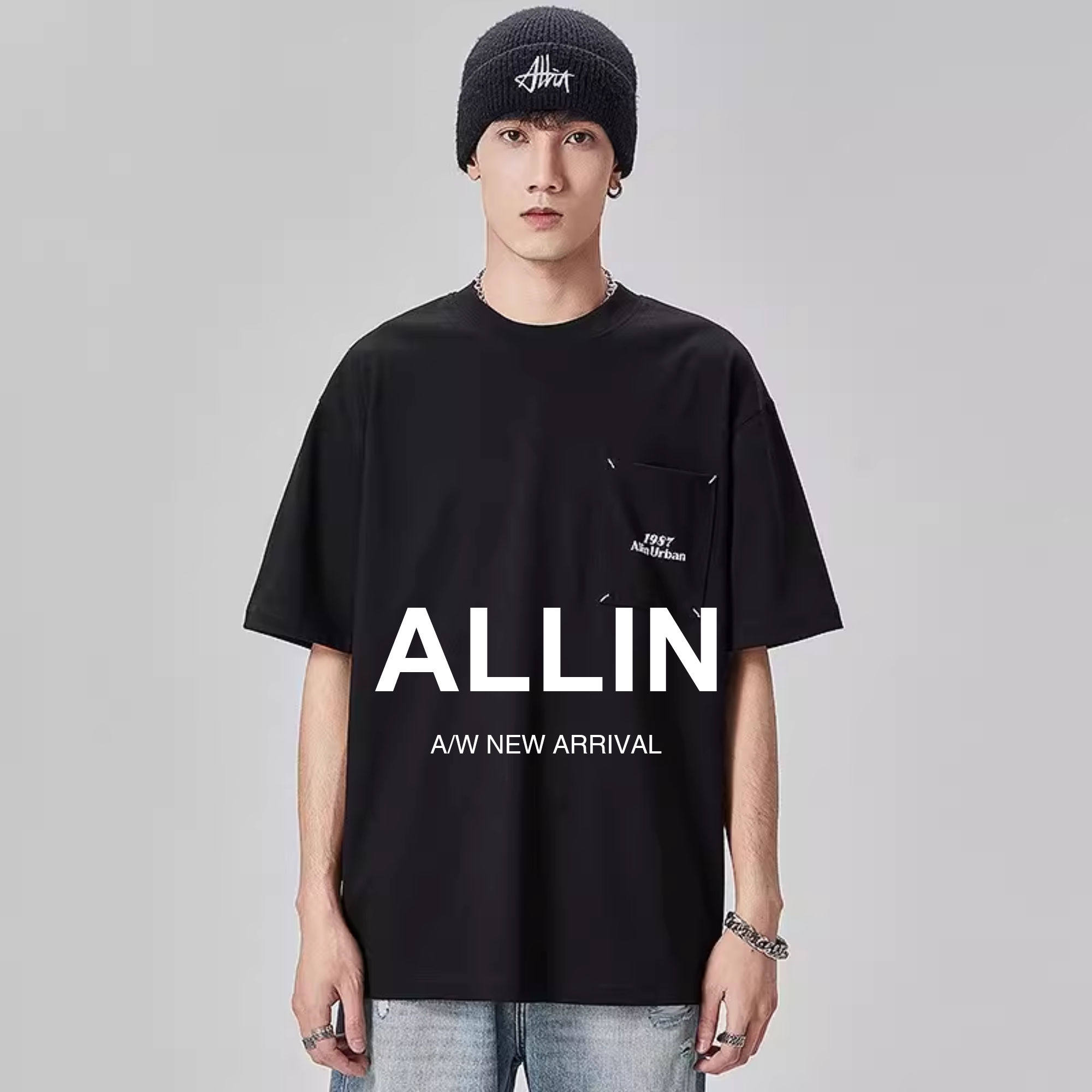 ALLIN 重磅短袖t恤男夏季简约复古宽松口袋黑色圆领半袖情侣上衣