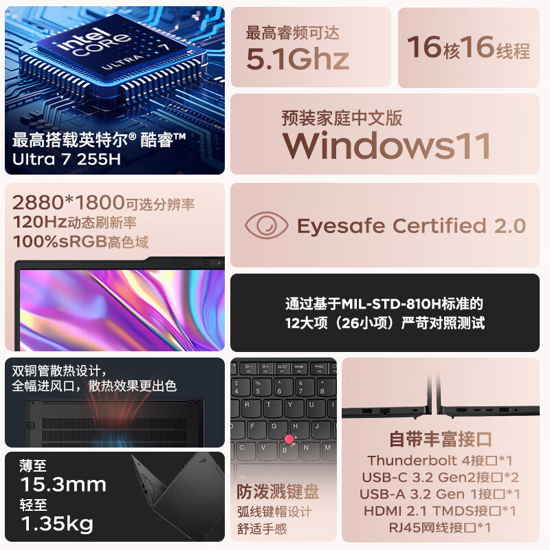 ThinkPadE14 2025新款 AI黑色商务办公本大学生笔记本电脑轻薄便携U系列二代处理器 黑色U7-255H32G1TB 2.8K