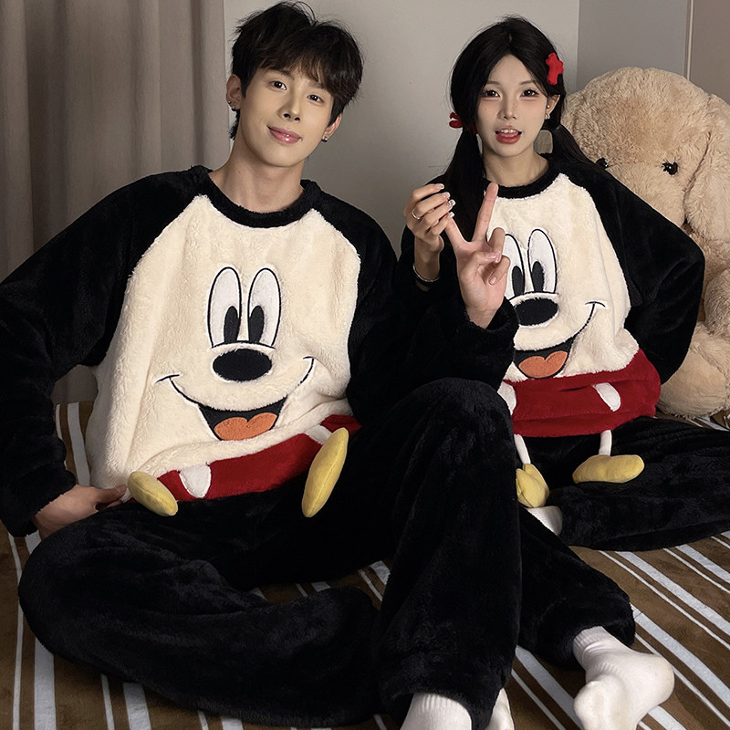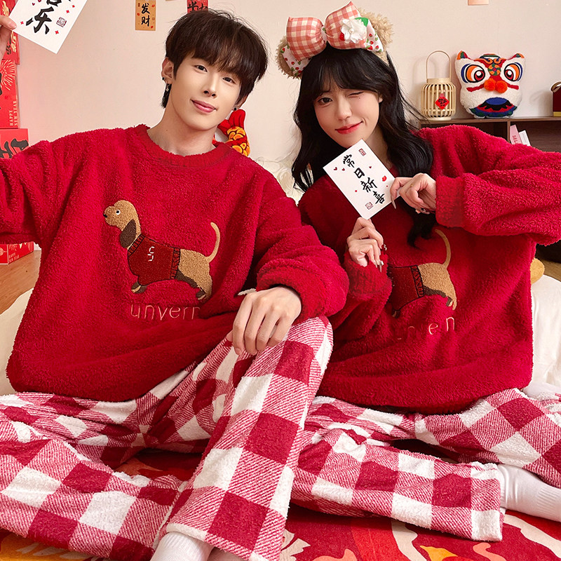 半边绒情侣睡衣女可外穿冬加厚本命马年红色套装男士珊瑚绒家居服