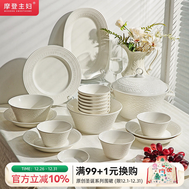 摩登主妇餐具2025新款白瓷浮雕乔迁新居新婚礼物碟筷碗盘套装家用