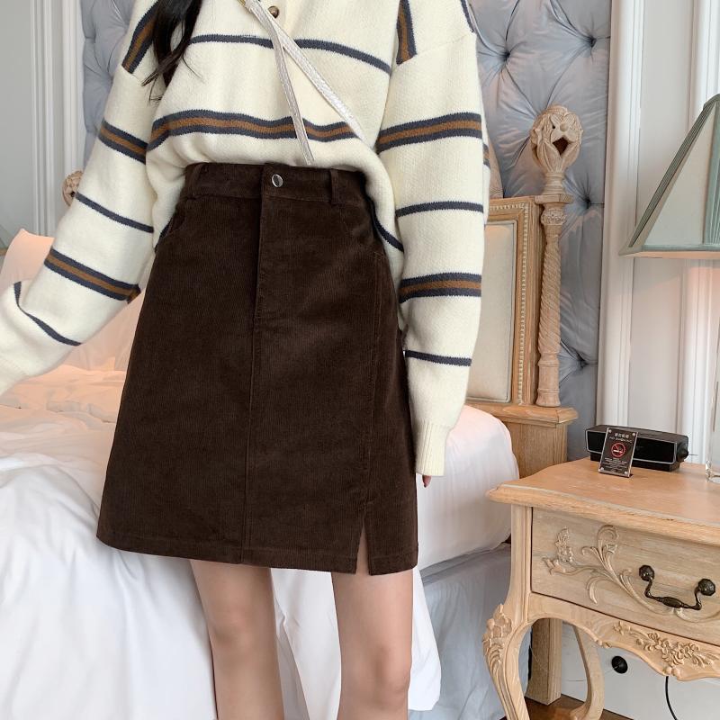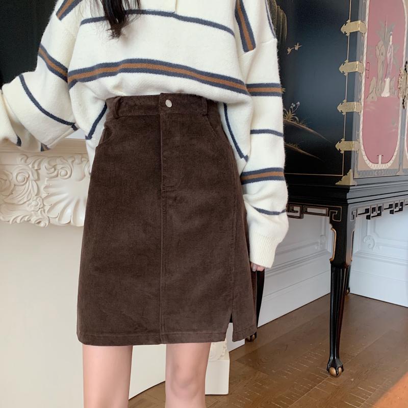 大码咖色侧开叉复古灯芯绒中裙女秋冬遮胯a字半身裙胖mm包臂短裙