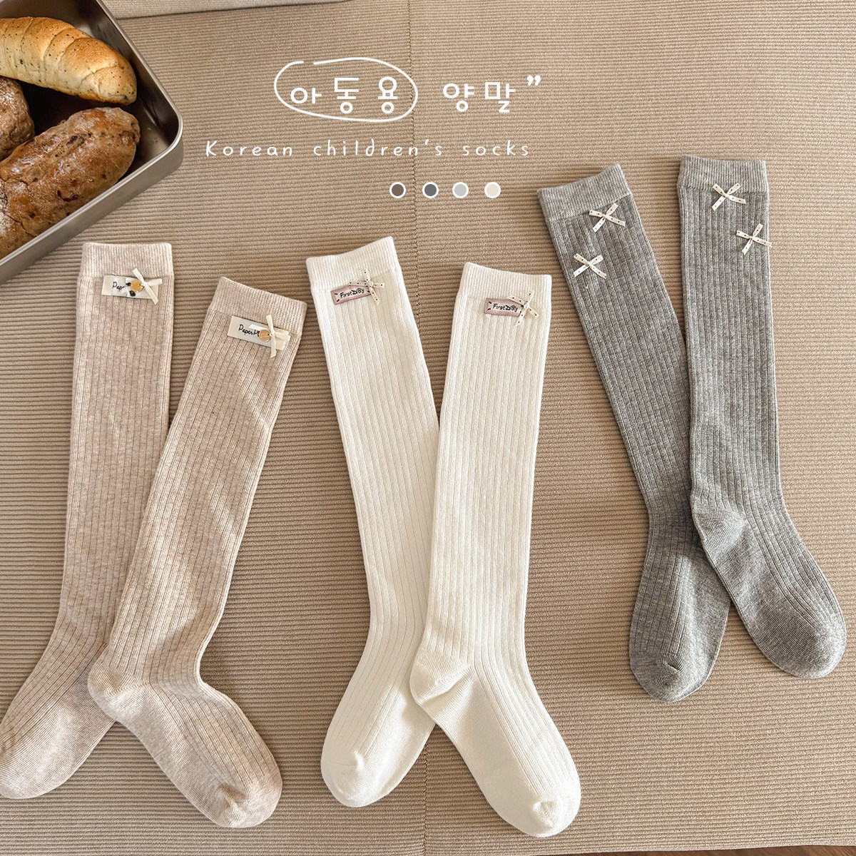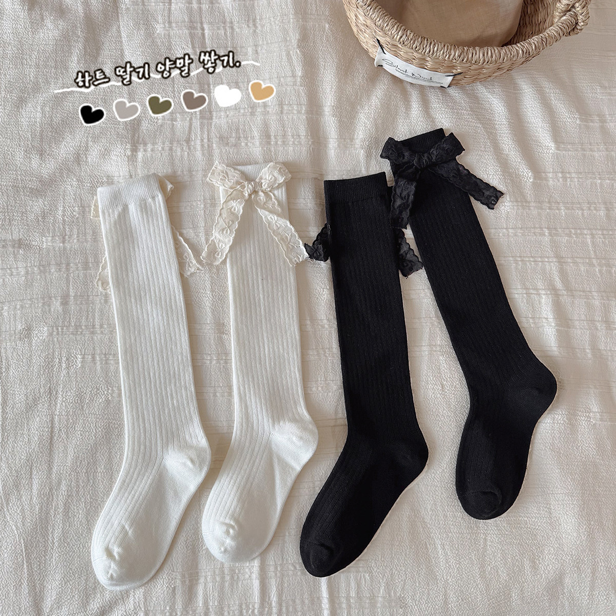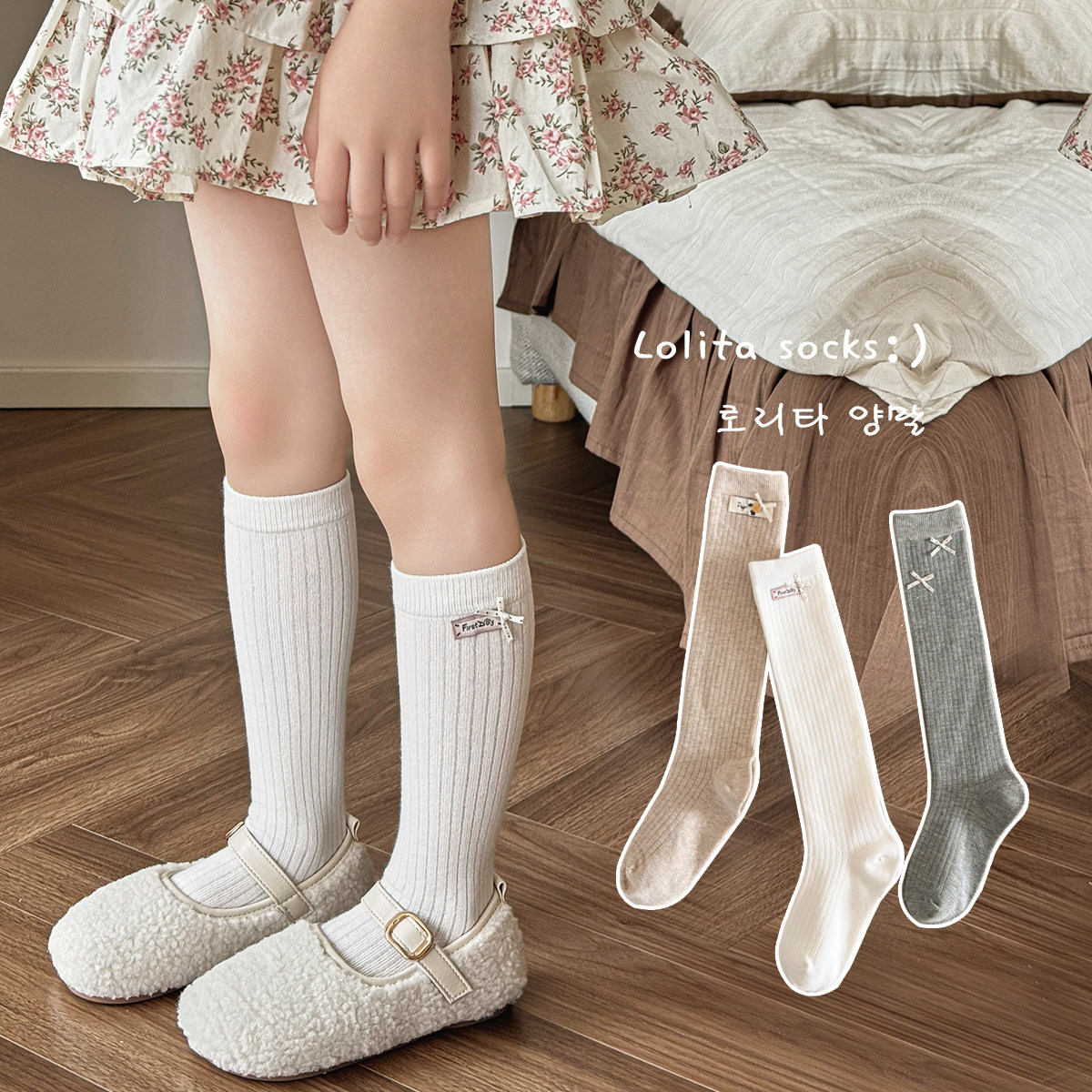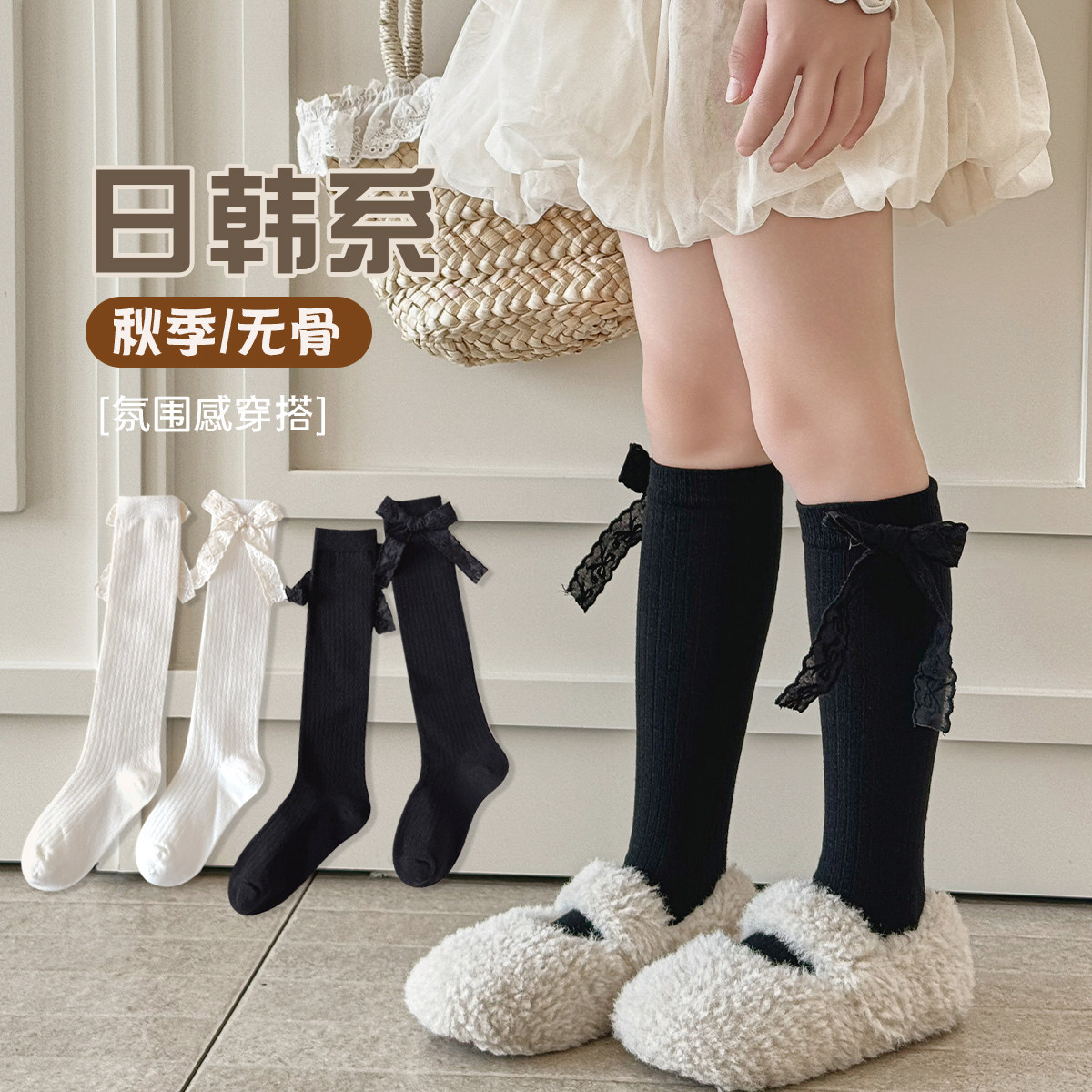 女童小腿袜韩系ins蕾丝蝴蝶结无骨长筒袜A类纯棉春秋季儿童袜子