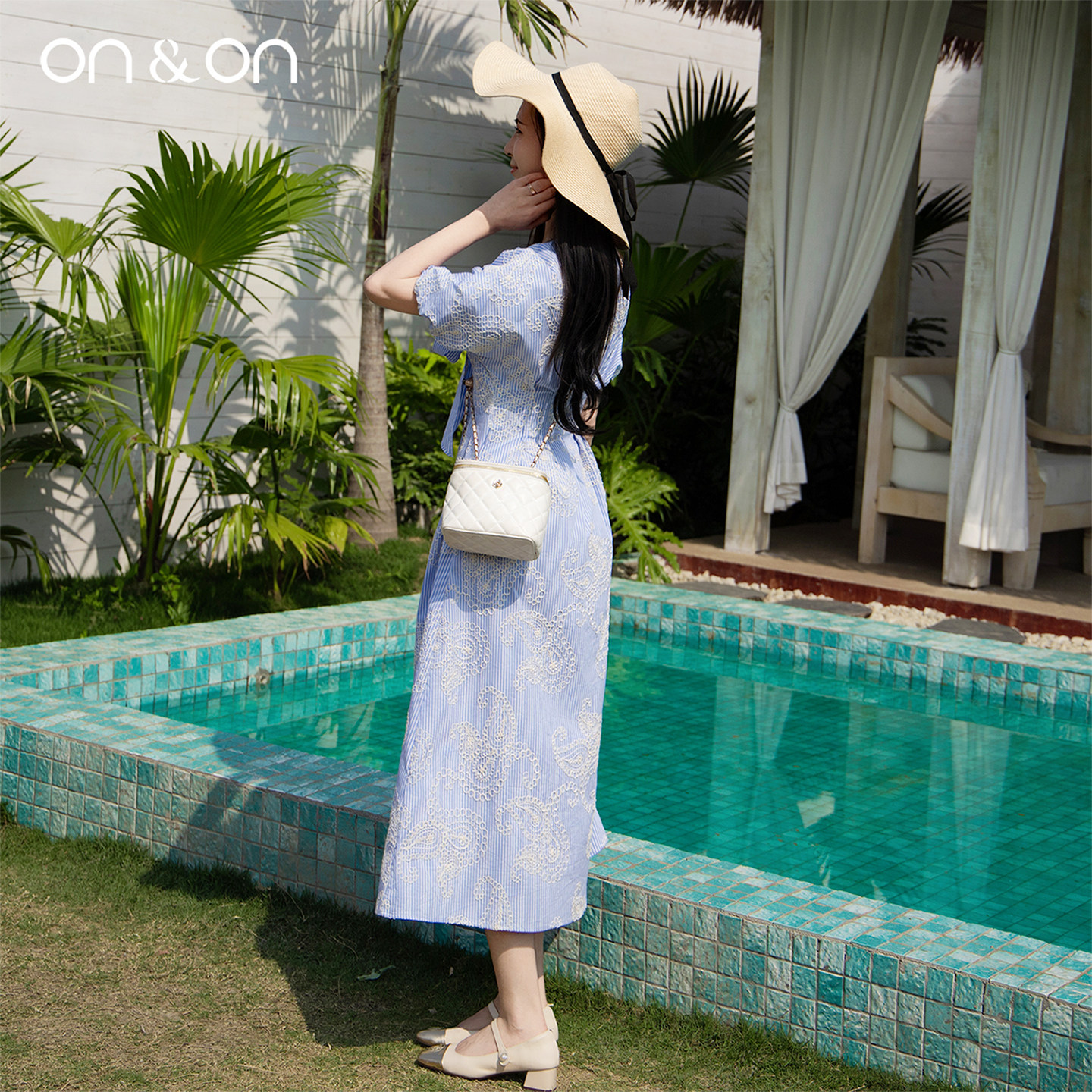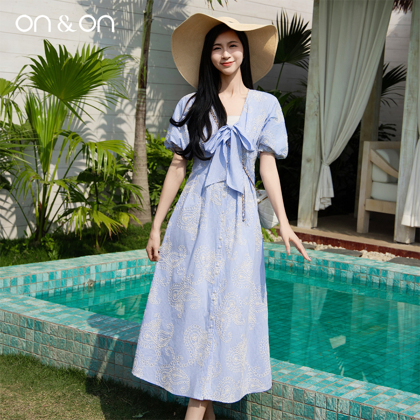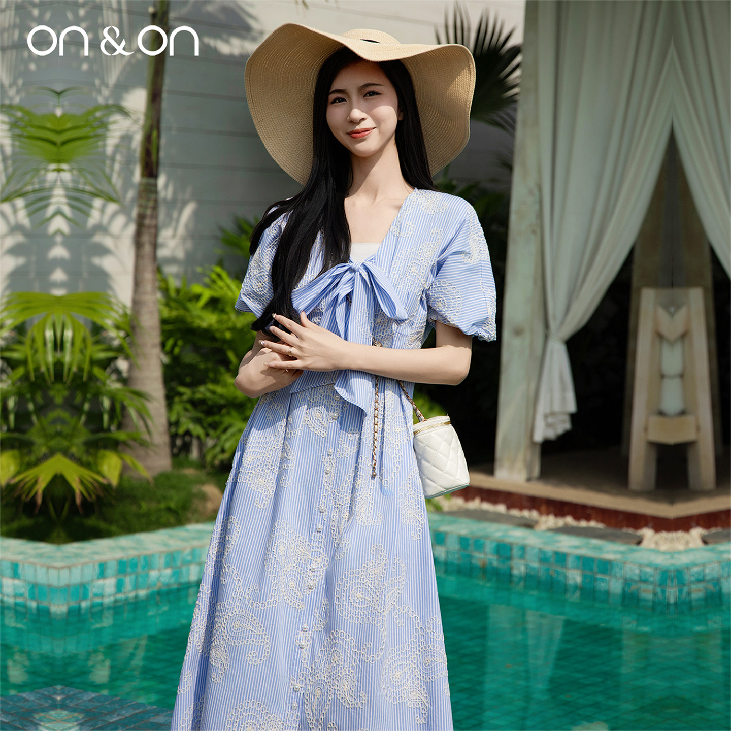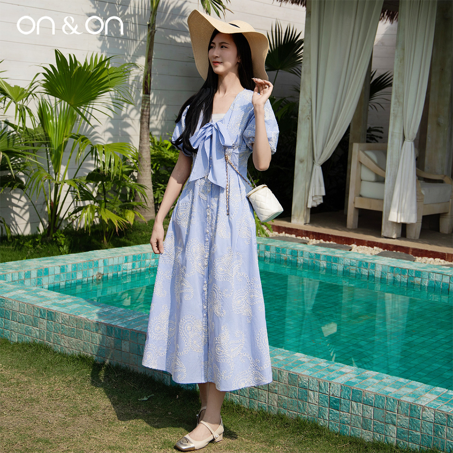 ON&ON/安乃安2025夏季新款法式系带蝴蝶结泡泡袖绣花气质连衣裙