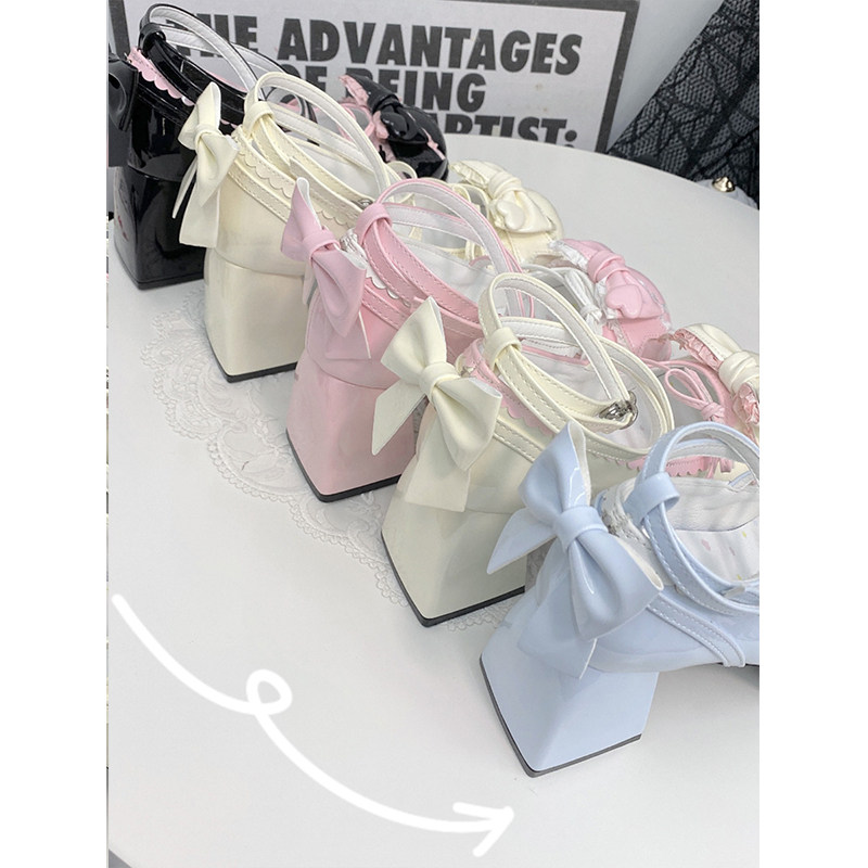 真皮~骄屿法式仙女风高跟鞋女婚鞋玛丽珍鞋珍珠系蝴蝶结粗跟单鞋