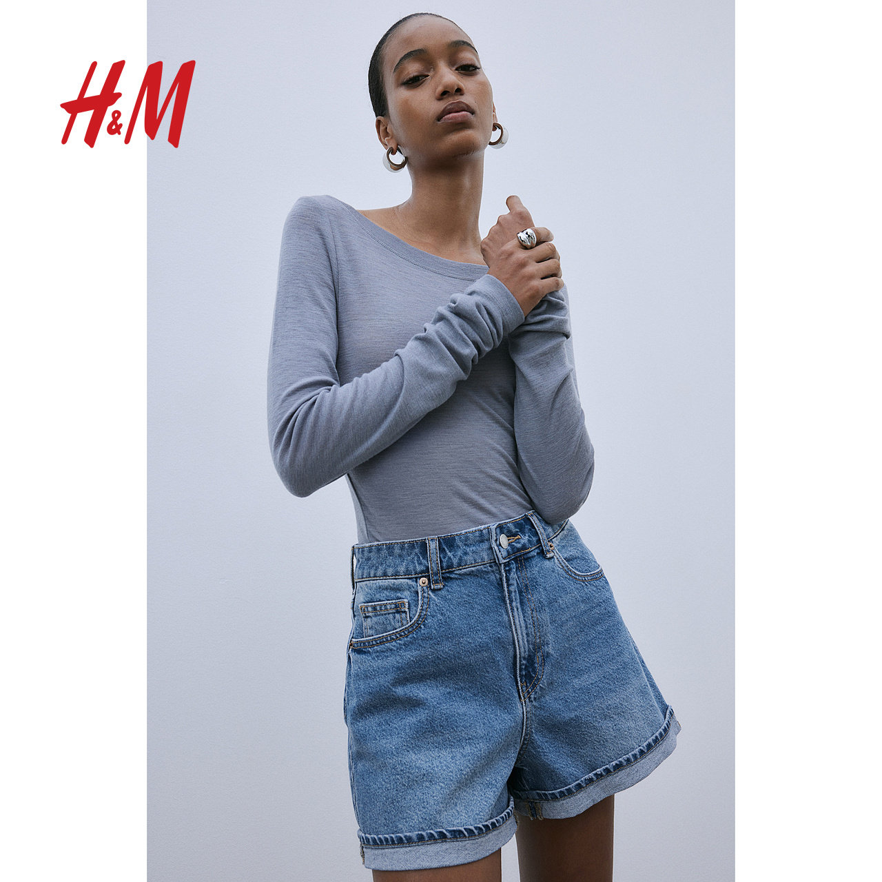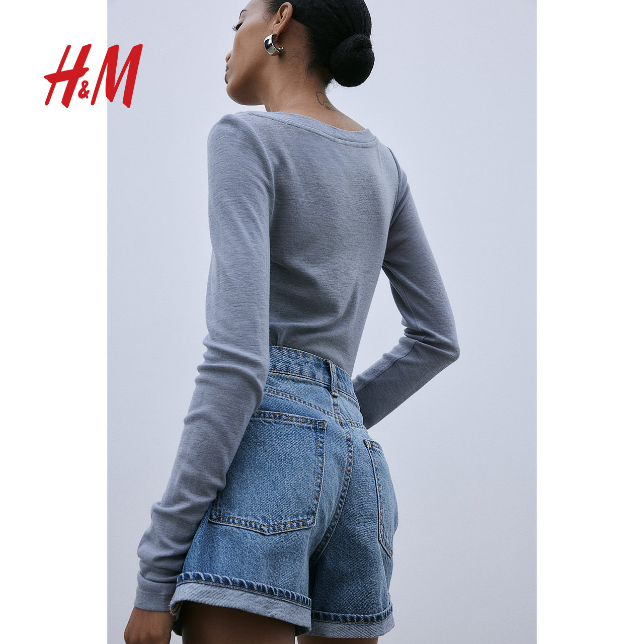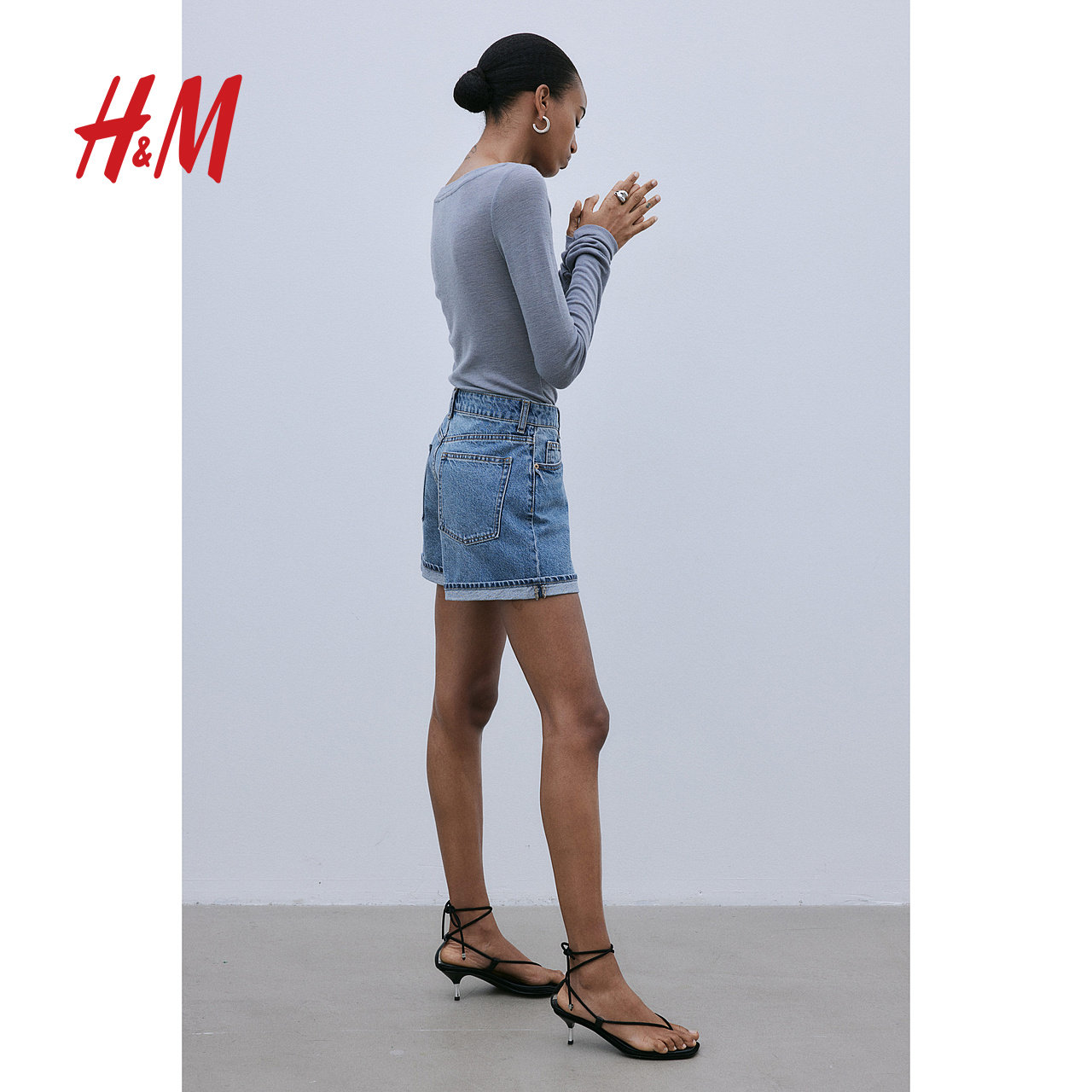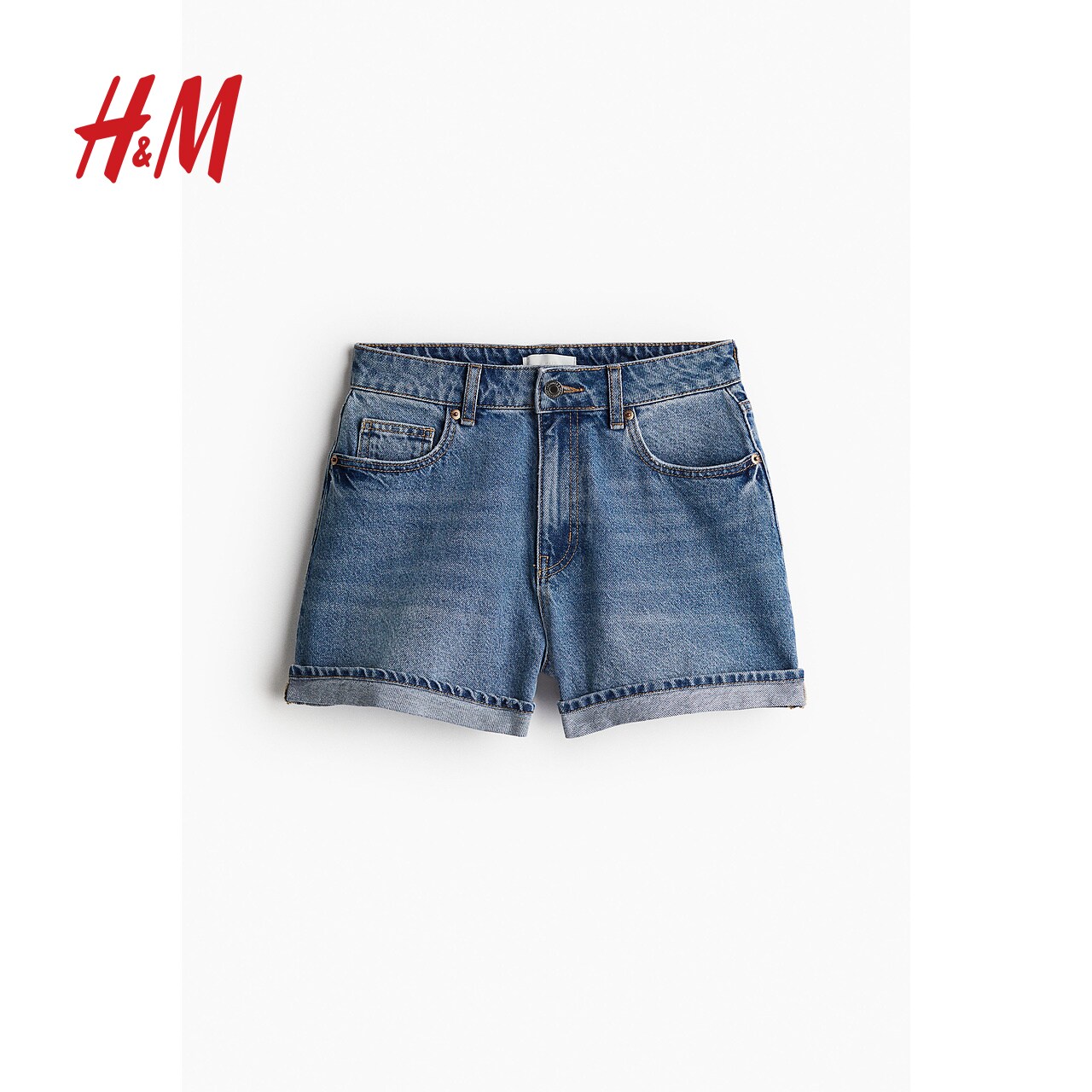 HM女装牛仔裤春季高腰直筒棉质舒适休闲翻折短裤1222120