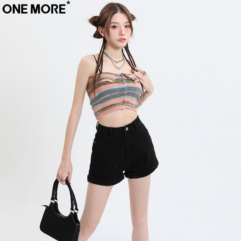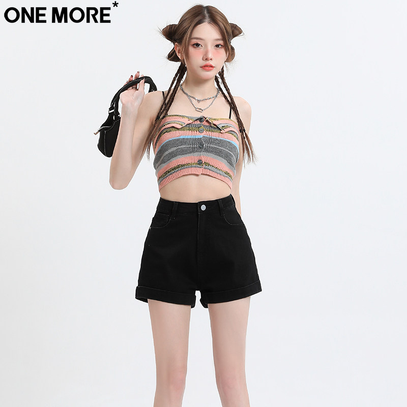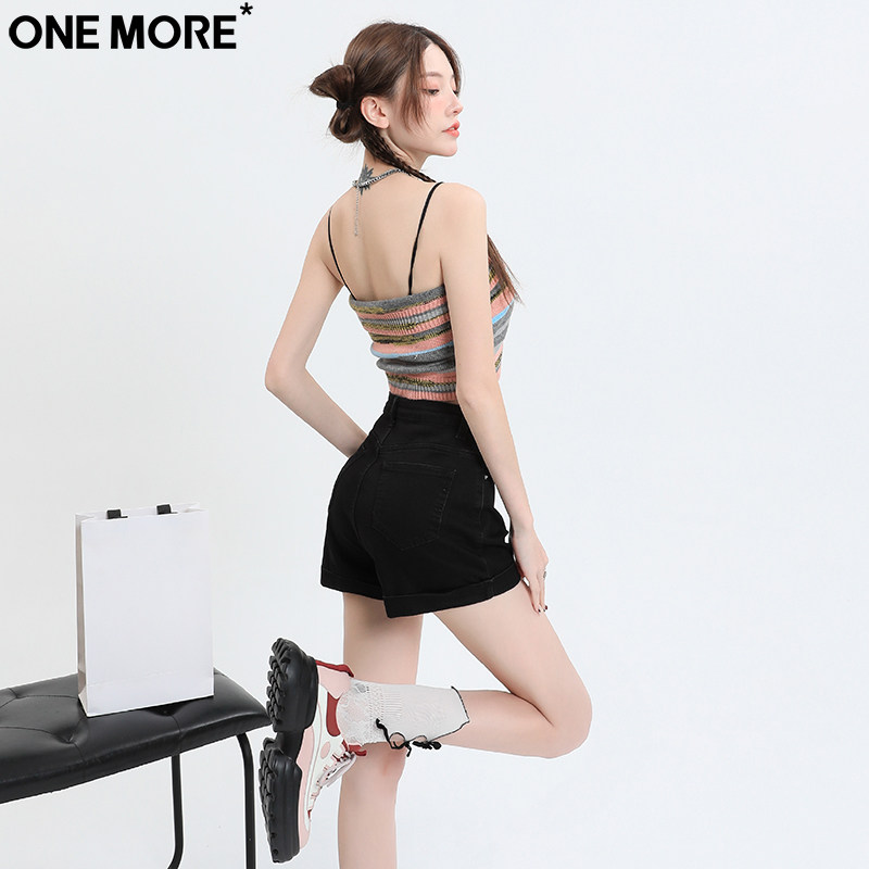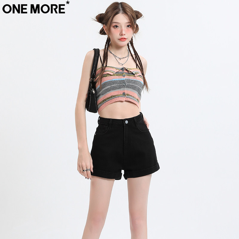 One More辣妹卷边黑色牛仔短裤女夏季高腰修身显瘦翻边a字热裤子