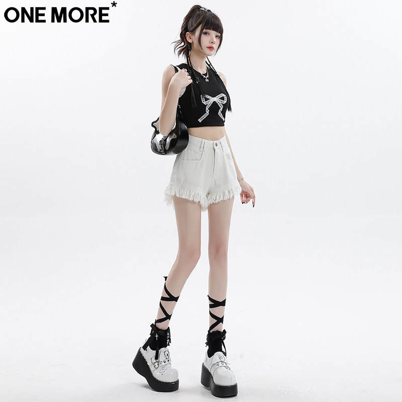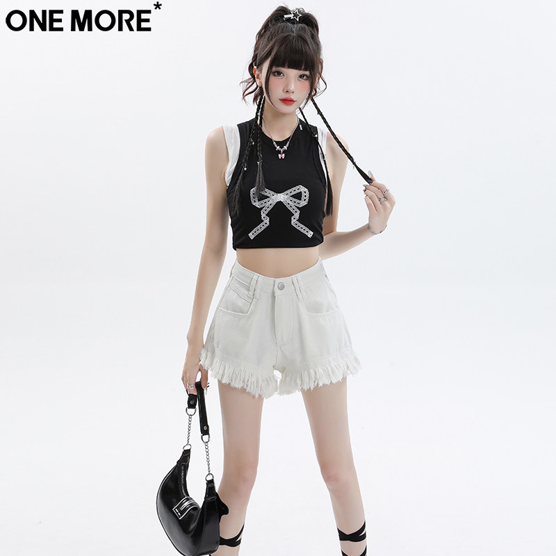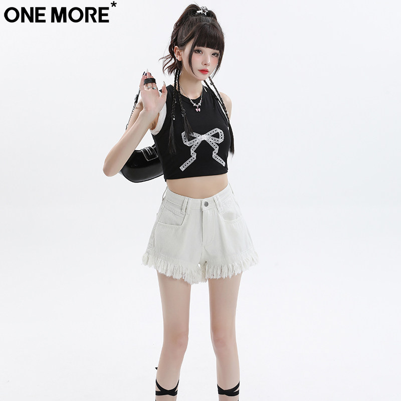 One More美式流苏白色牛仔短裤女夏季高腰显瘦百搭短款a字热裤子