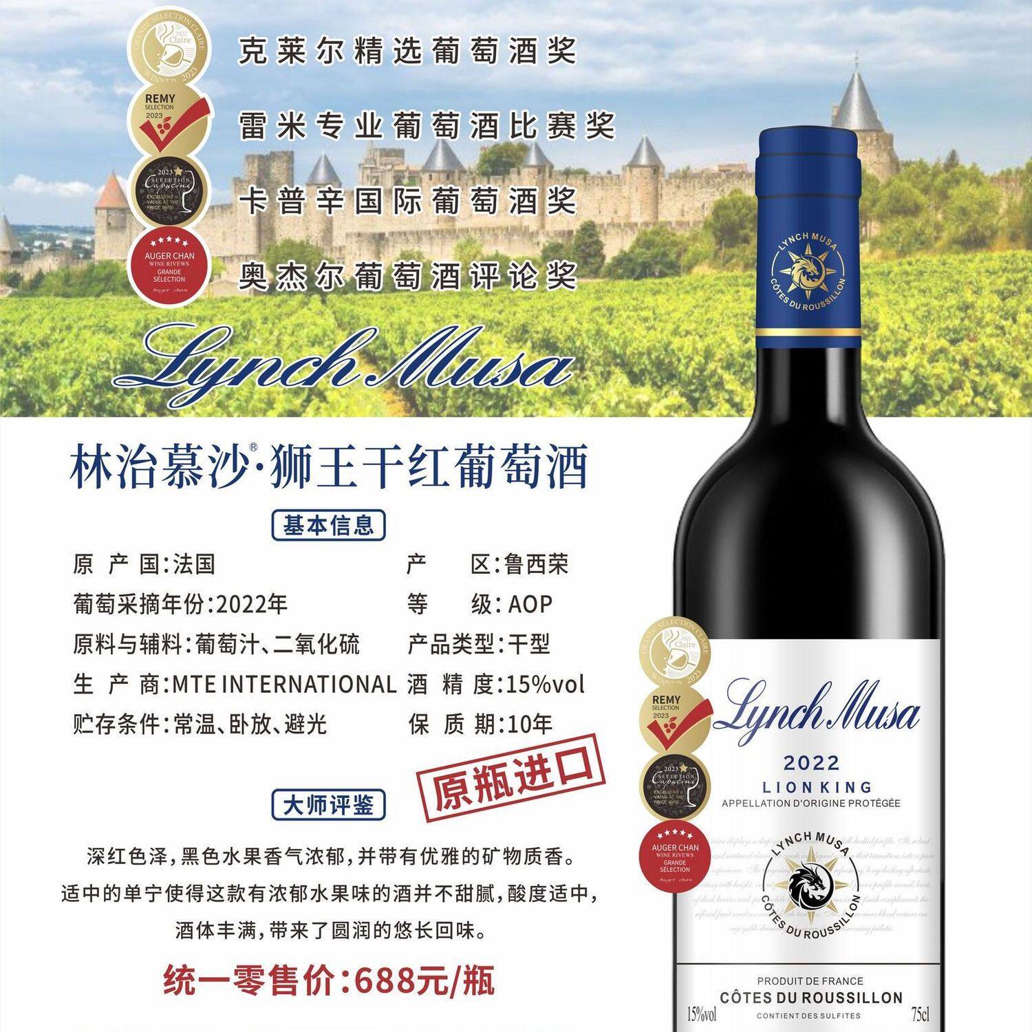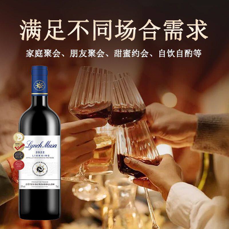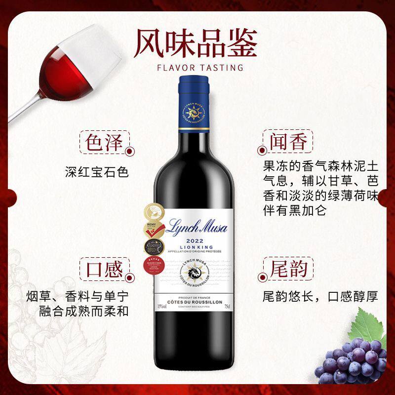 法国原瓶进口林治慕沙·狮王AOP干红葡萄酒红酒15度整箱750ml酒庄