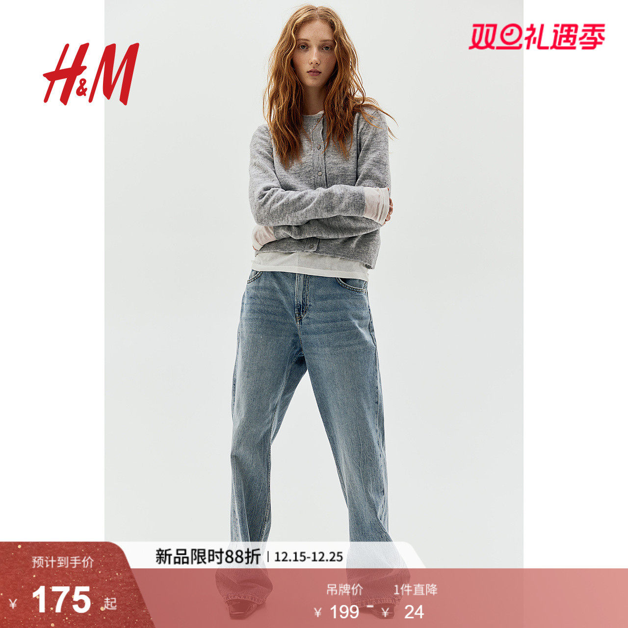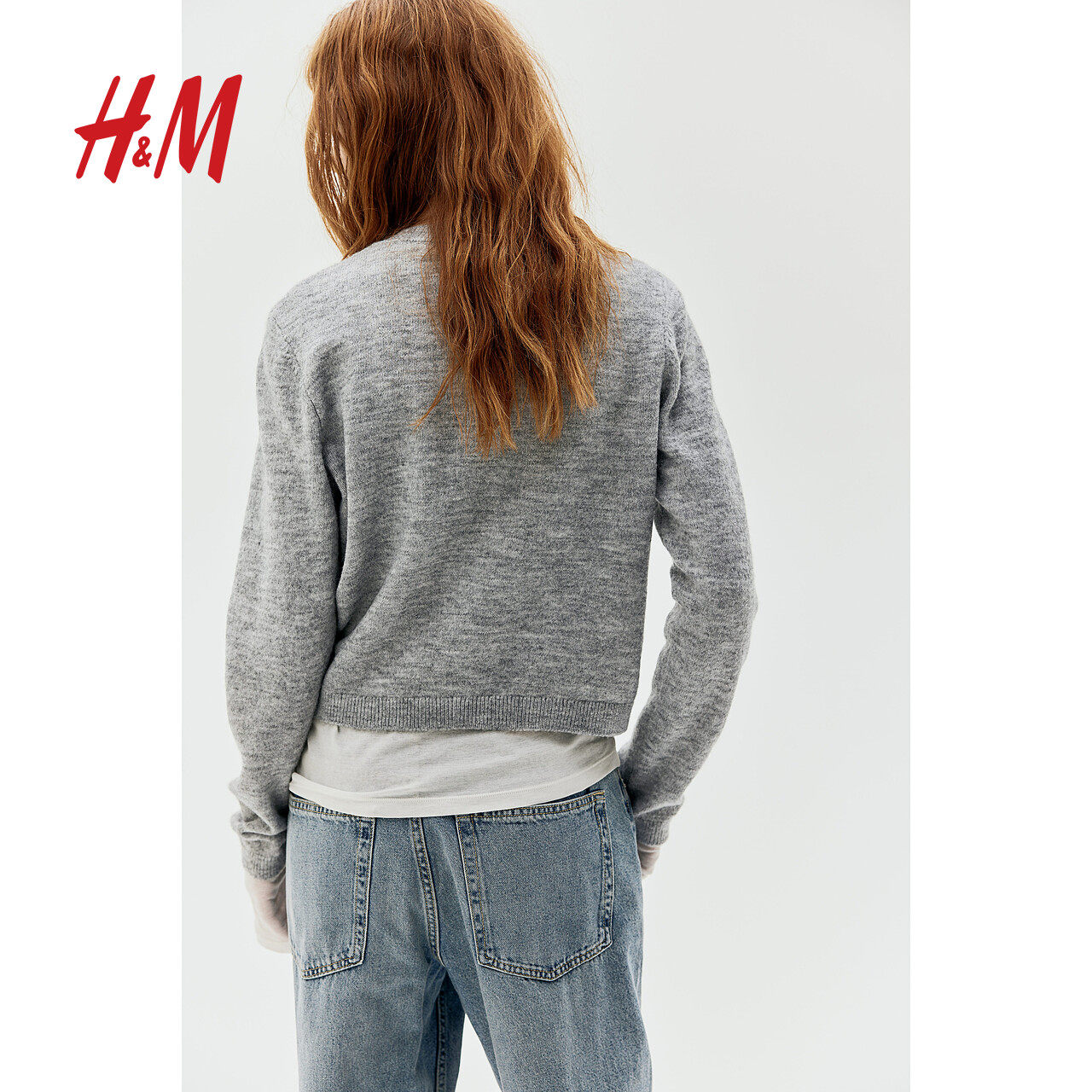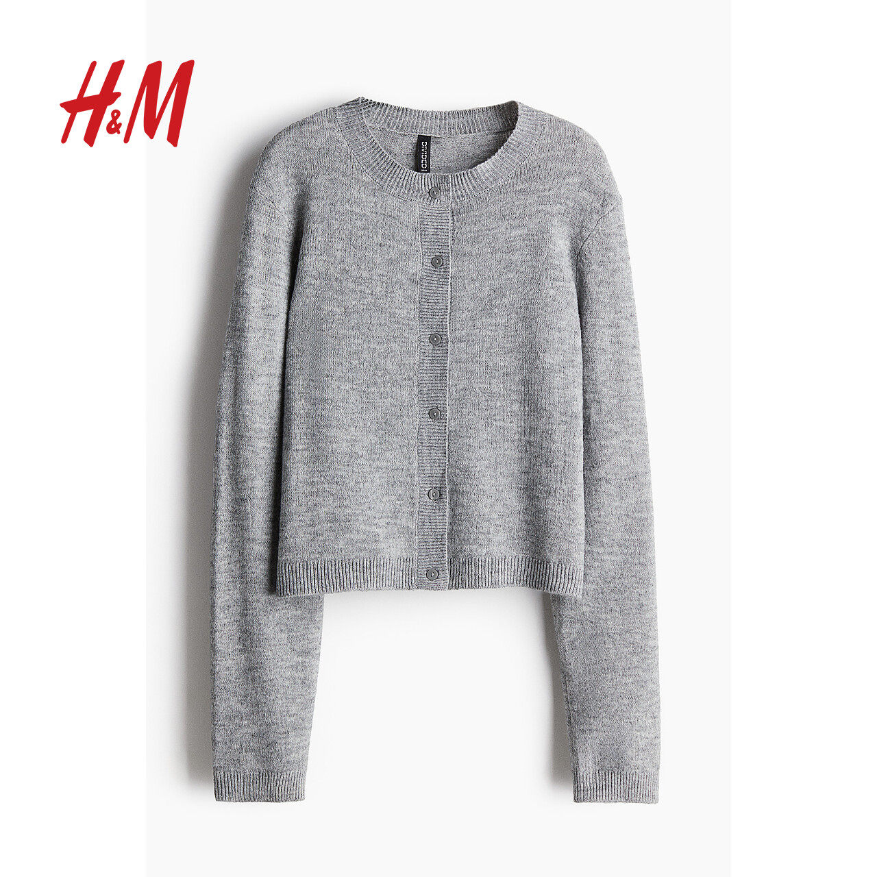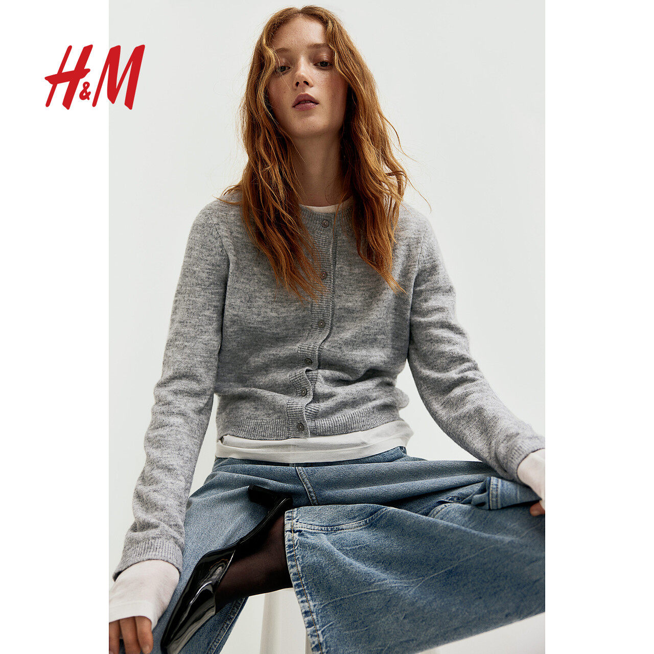 HM女装毛针织衫冬季圆领长袖时尚简约细密针织miu系开衫1245736