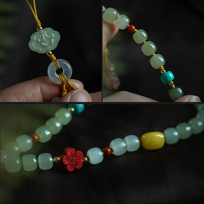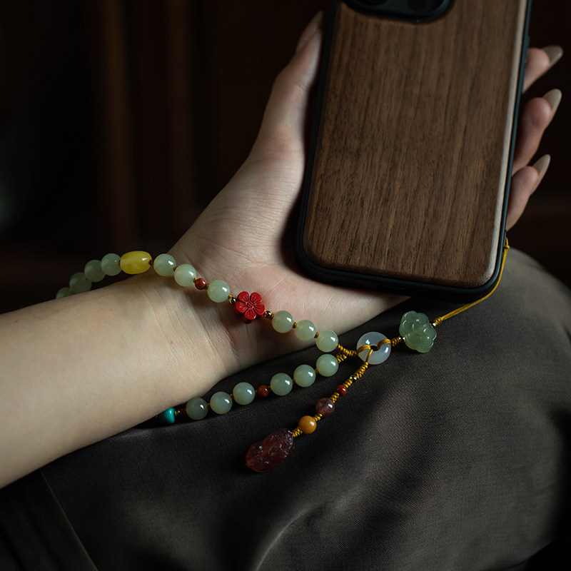 大善堂天然和田玉祥云高级珠手腕挂绳女平安扣貔貅手机链独特渐变