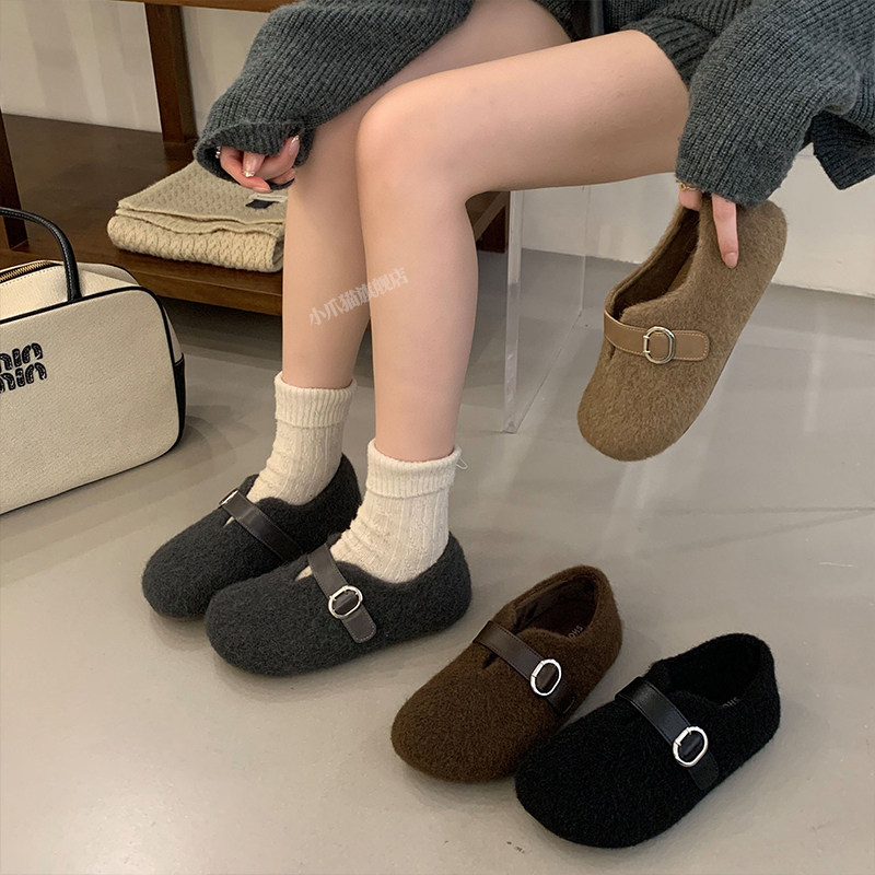 冬季加绒兔毛手工虎头鞋中式民族风汉服女棉鞋厚底保暖松糕勃肯鞋