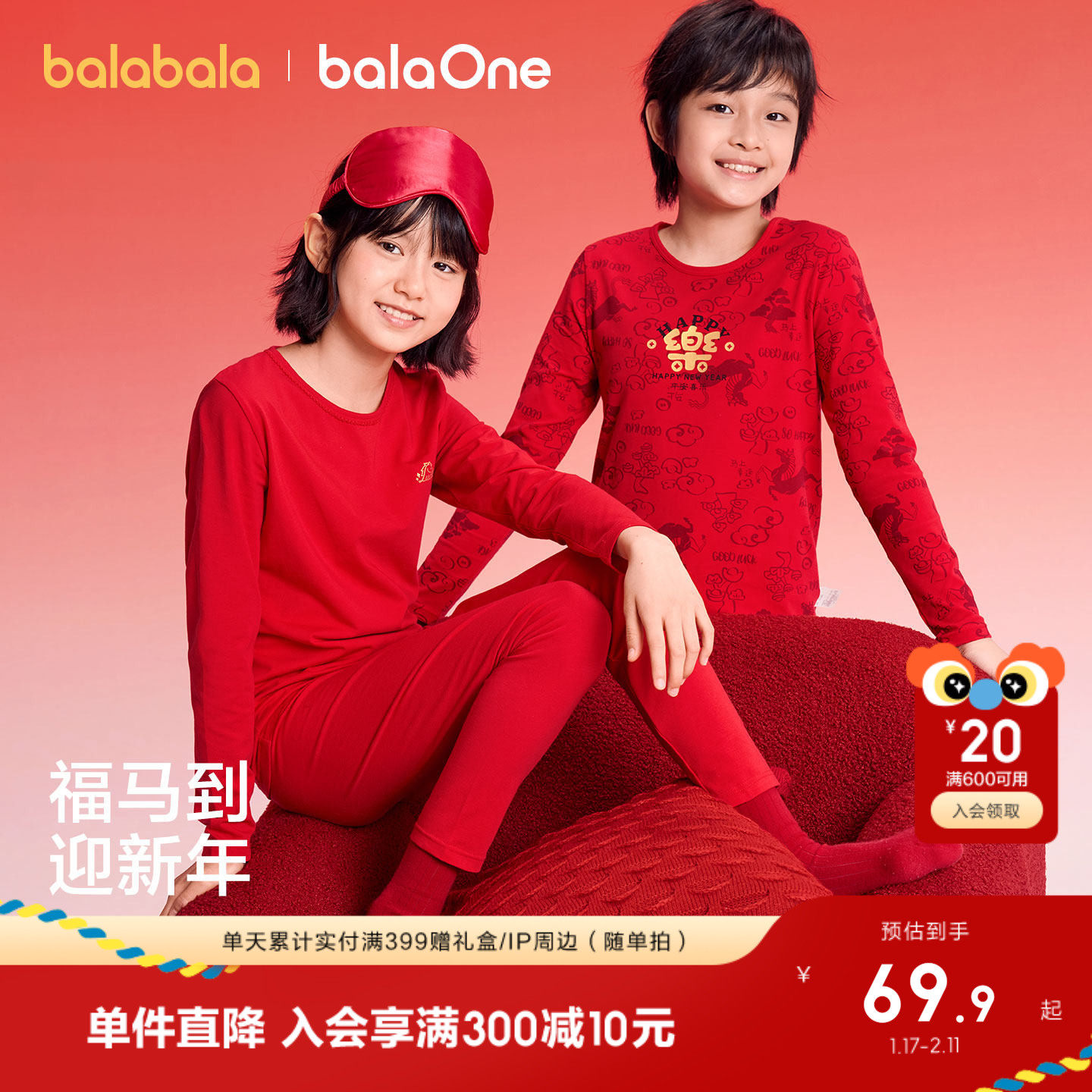 巴拉巴拉儿童内衣套装棉男童秋衣秋裤女童睡衣打底衫红色本命新年