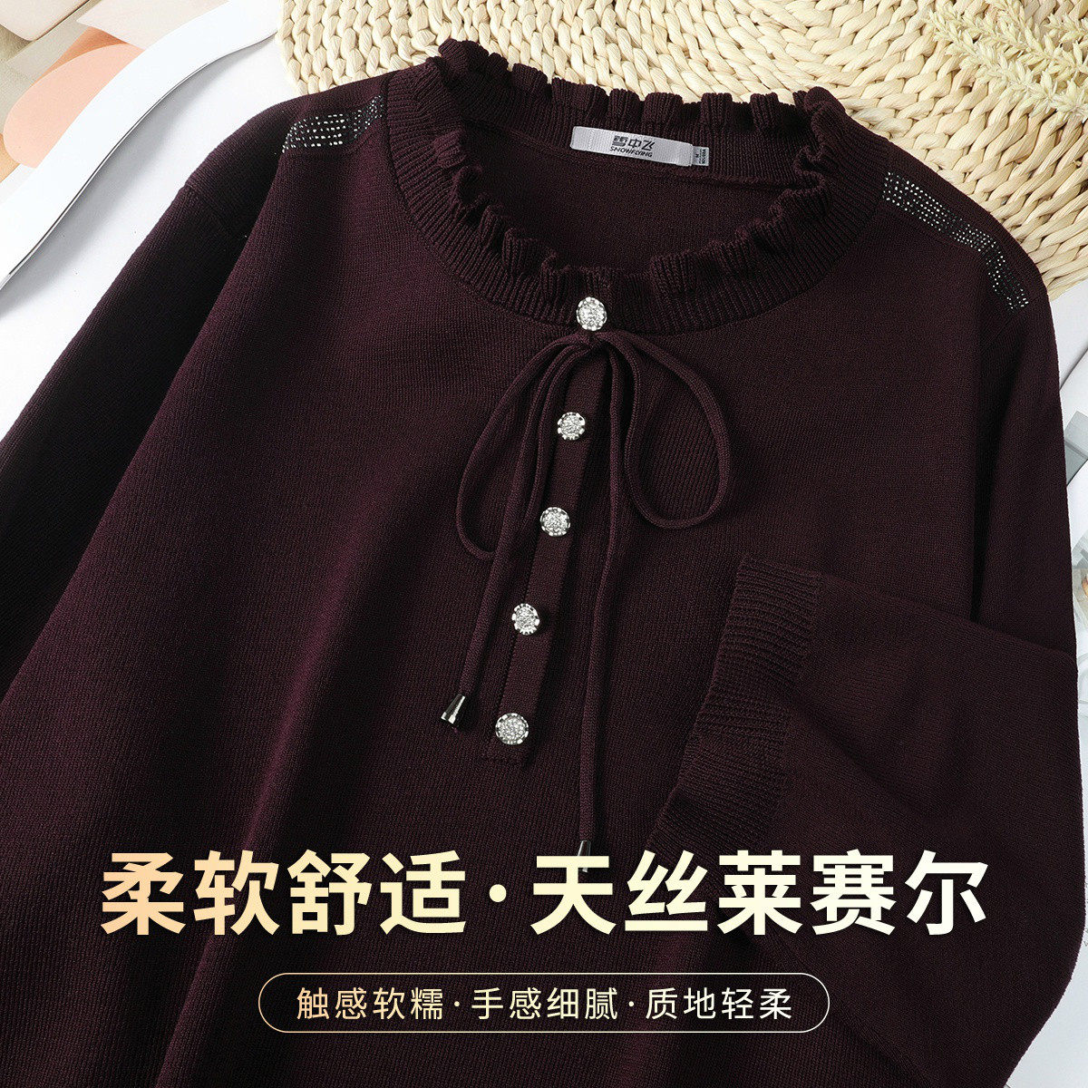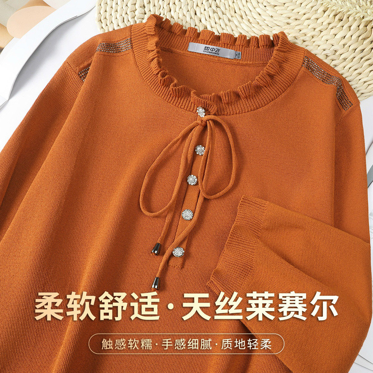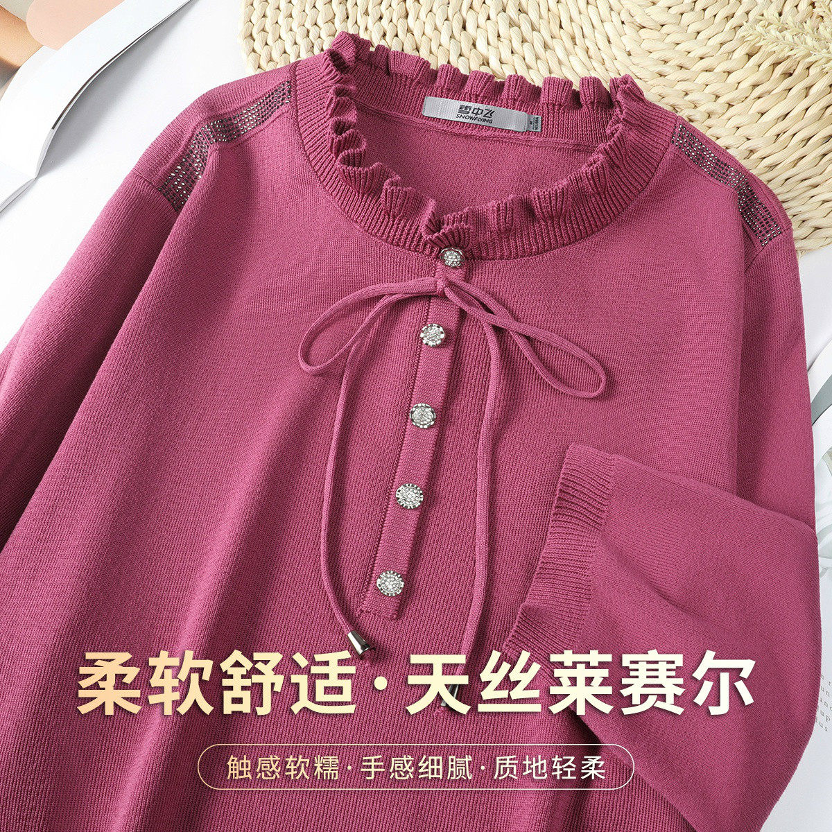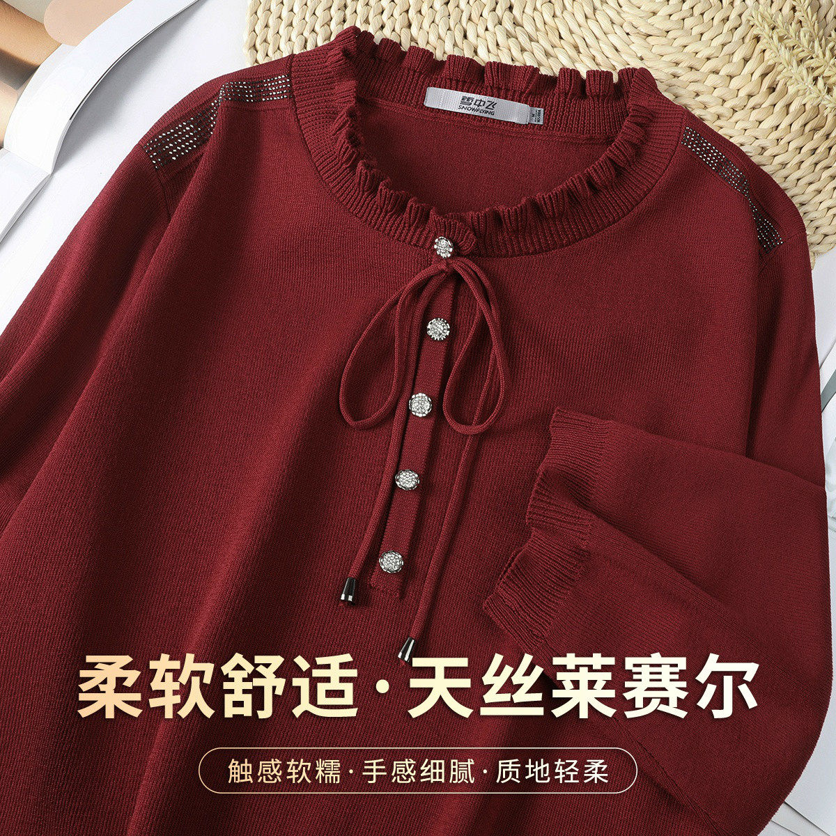 雪中飞 花边领烫钻针织衫温柔甜美系女春季七分袖减龄莱赛尔上衣