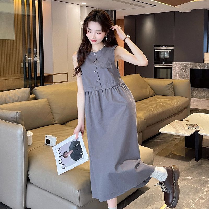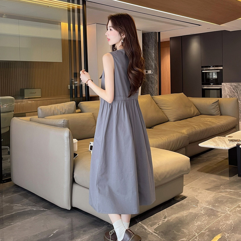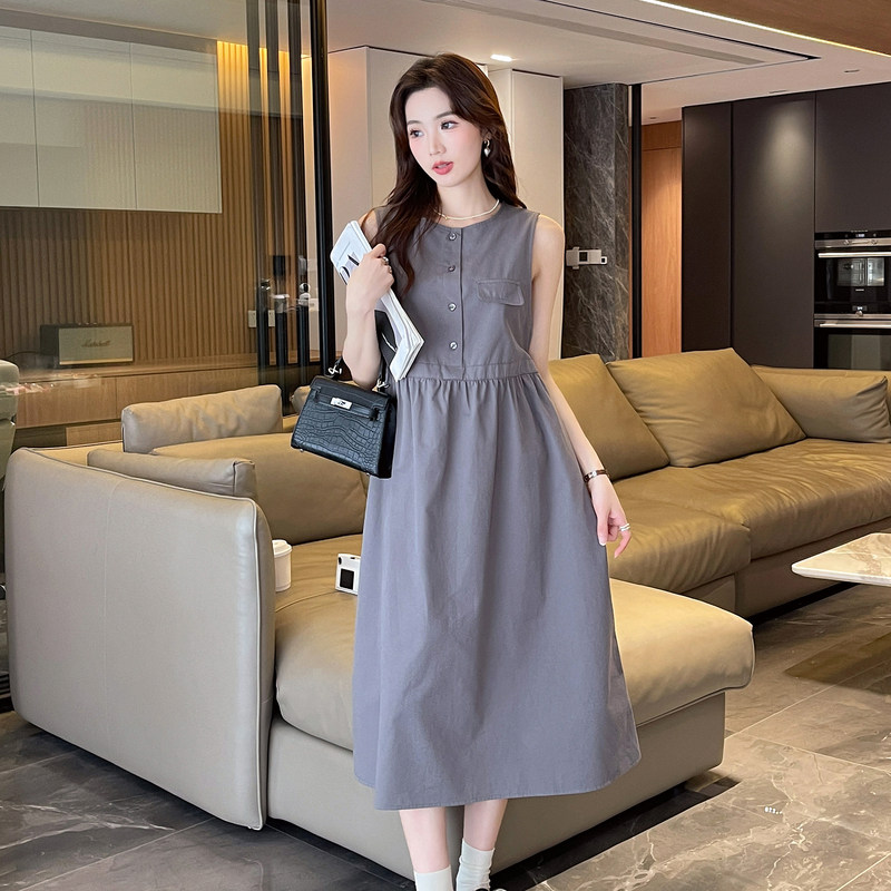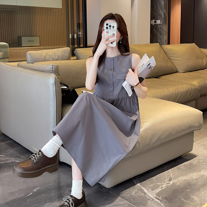 唐狮圆领无袖连衣裙女夏季新款工装百搭休闲气质通勤长裙r2