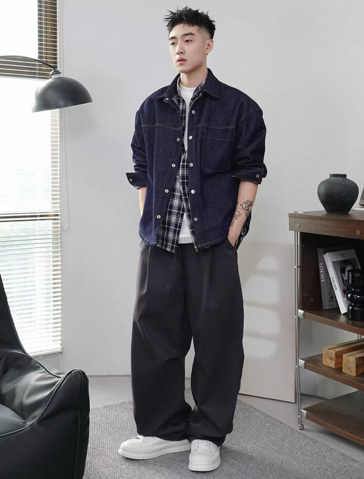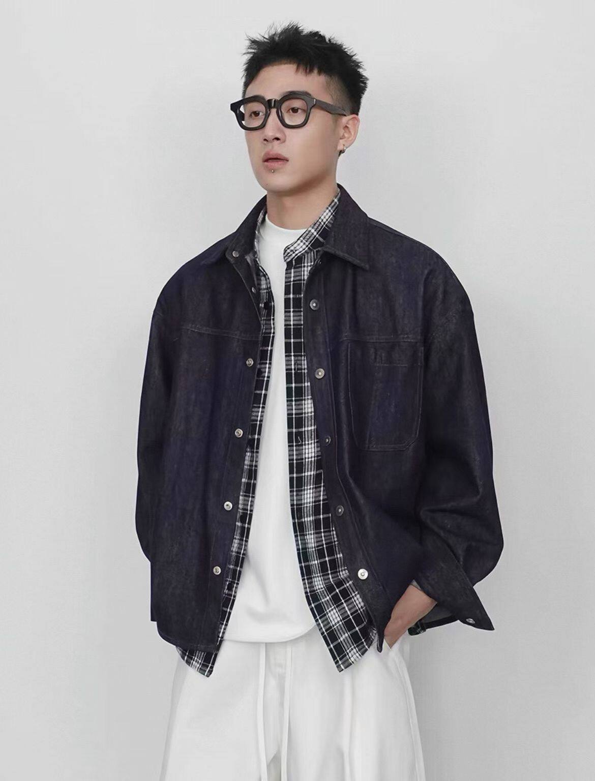 春秋季复古新款设计感格子衬衫拼接假两件夹克工装牛仔外套男潮