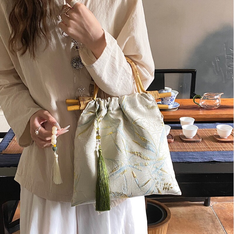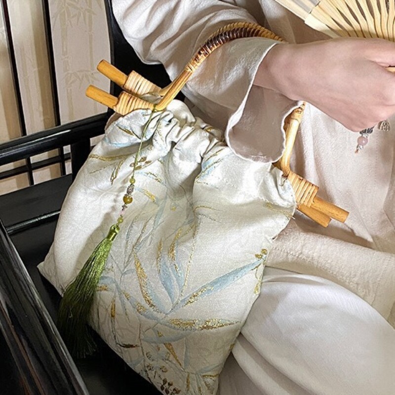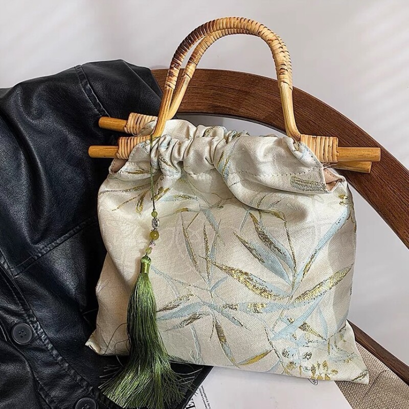 竹叶提花汉服包包女2026新款竹节藤编手提包新中式旗袍手挽竹节包