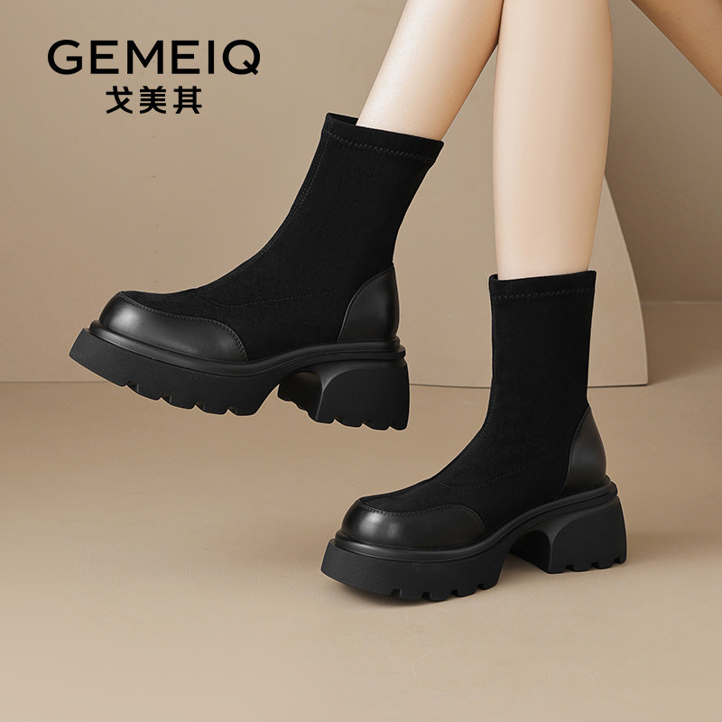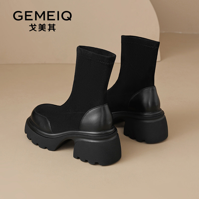 戈美其高跟短靴女舒适春秋新款绒面靴子法式黑色弹力瘦瘦靴袜靴