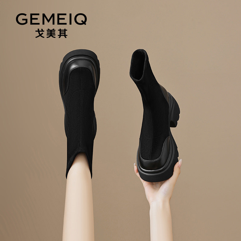 天美意复古厚底增高加绒弹力时装靴过膝长靴女鞋子冬新款休闲短靴