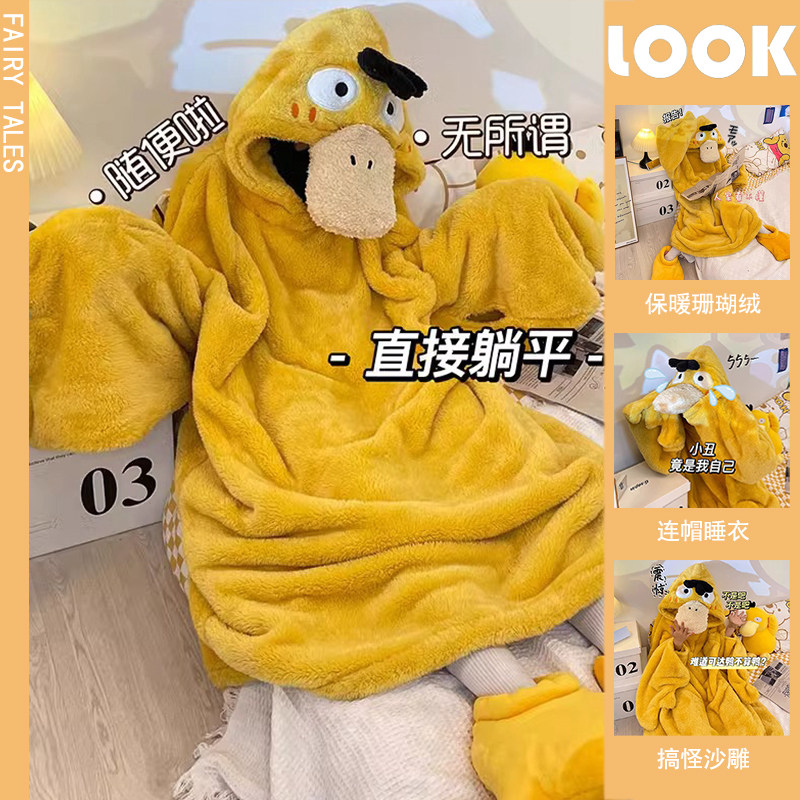 丑鱼睡袍珊瑚绒睡衣秋女款2025新款冬季男加厚睡裙卡通连体家居服