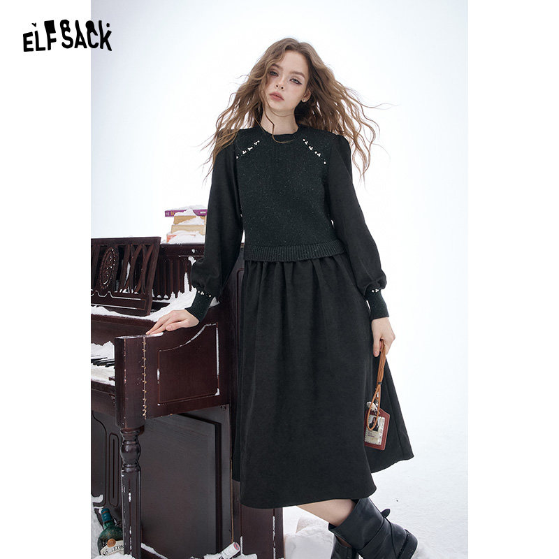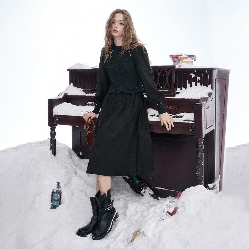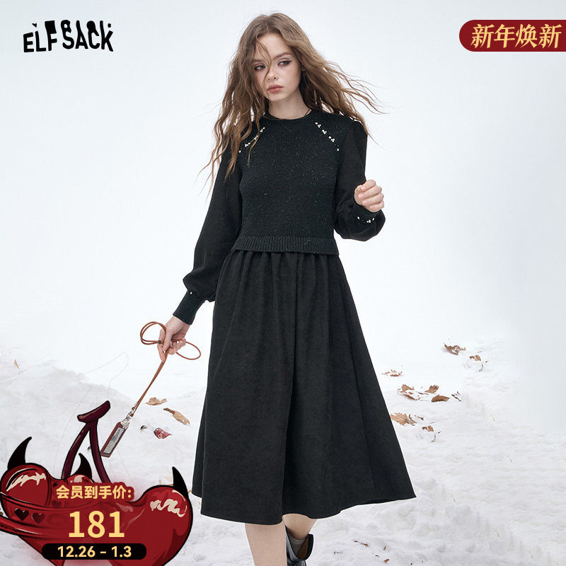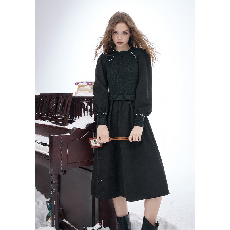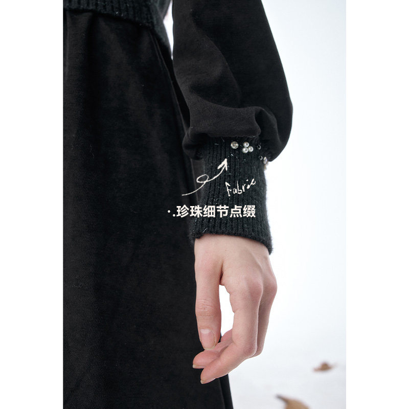 妖精的口袋珍珠黑色针织拼接连衣裙女2025年冬季新款甜美收腰裙子