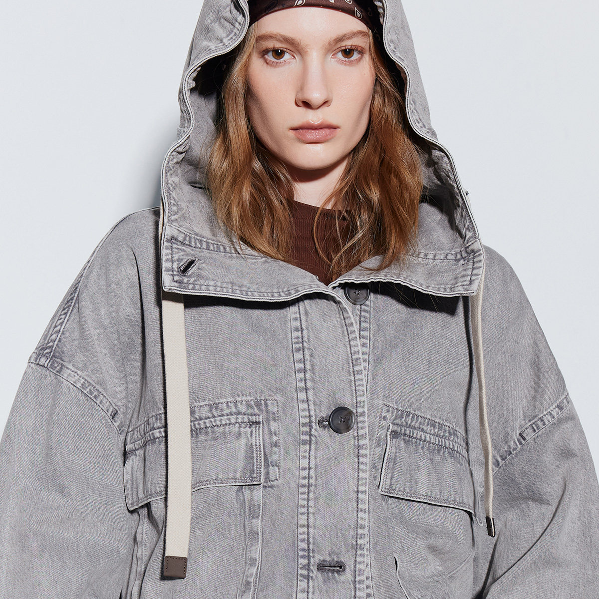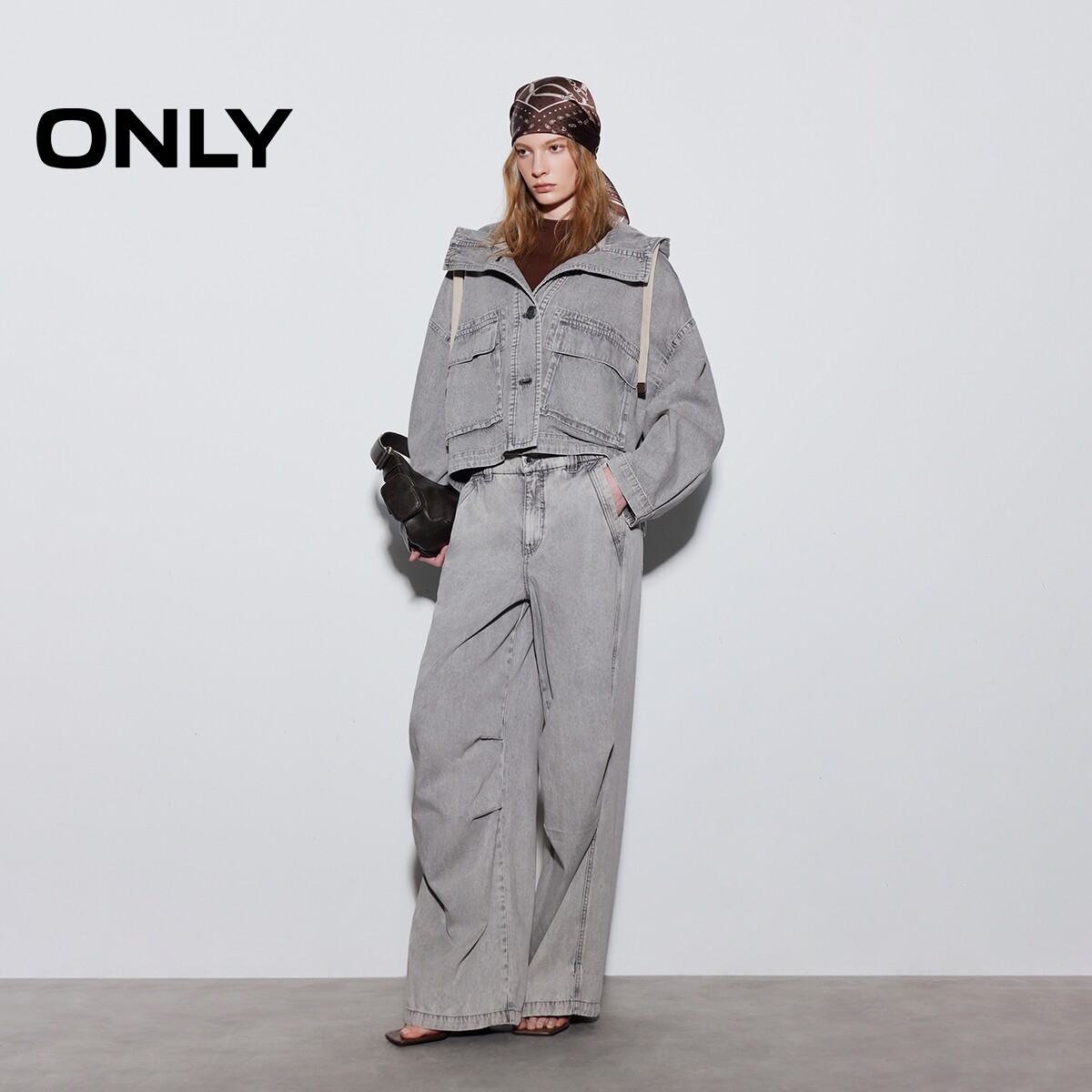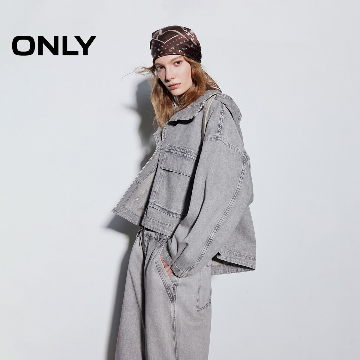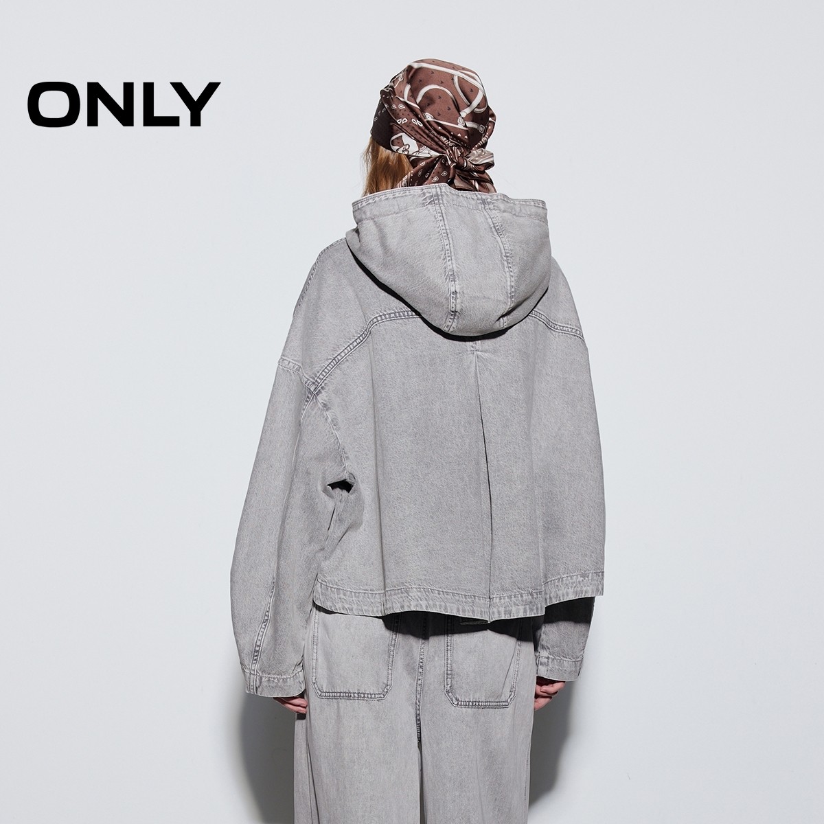 ONLY2026春季新款纯棉宽松短款立体翻盖口袋连帽落肩牛仔外套女