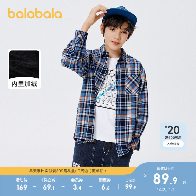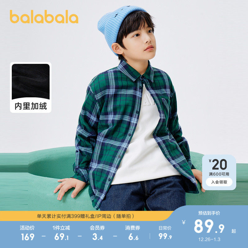 巴拉巴拉童装男童衬衫长袖加绒中大童格子印花衬衣洋气上衣潮休闲